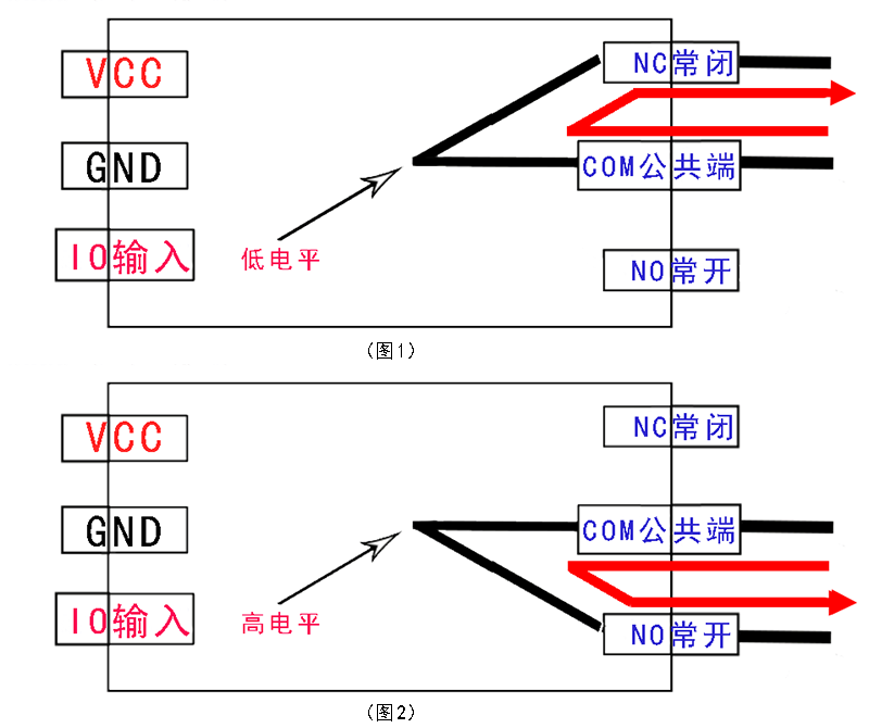 A:在下面是继电器的工作原理,VCC和GND分别接开发板的 +5V 和 GND ,IO输入默认低电平,公共端和常闭端相连(图1),高电平则通过继电器的吸合,让公共端和常开端相连(图2),因此公共端接入的电压是根据所控制的电器决定的,切忌随意选择电压进而导致电器损坏等后果;