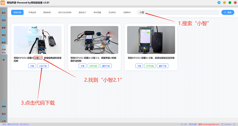 2.1 开源平台-输入 小智 并搜索-代码下载自动打开