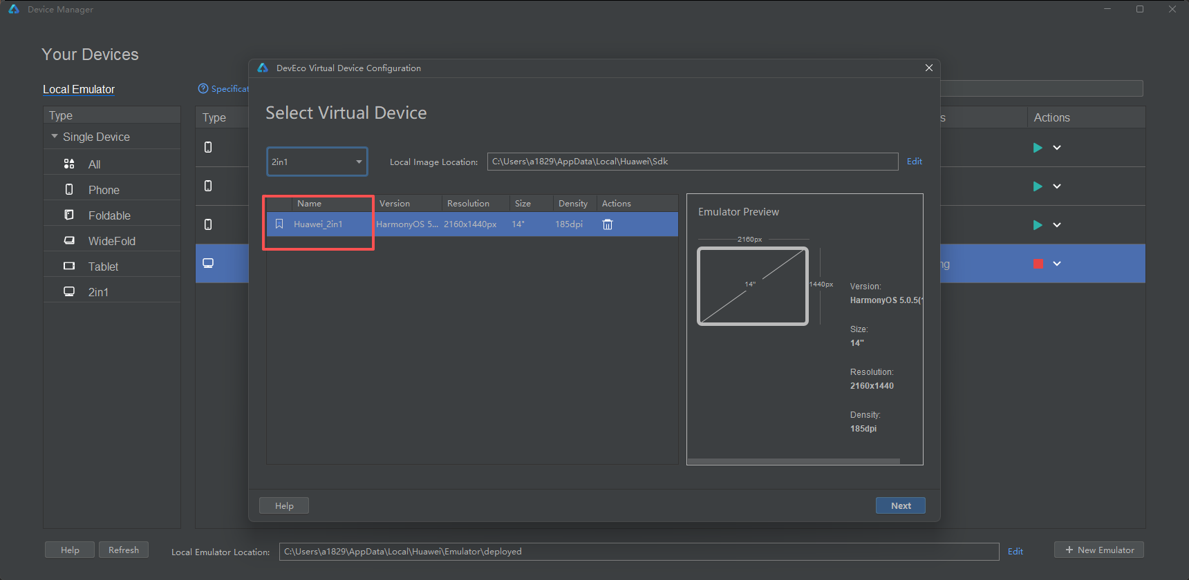 如果你手头暂时没有华为的物理鸿蒙 PC 设备,DevEco Studio 自带的 Local Emulator(模拟器)是最佳的替代方案。
