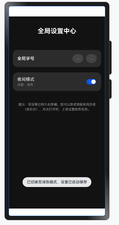 以下通过“全局主题切换”功能(支持深色模式与字体大小调整)演示三者的协同工作。需求包括:设置在所有页面生效,且应用重启后配置依然保留。