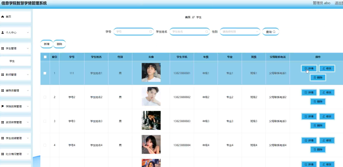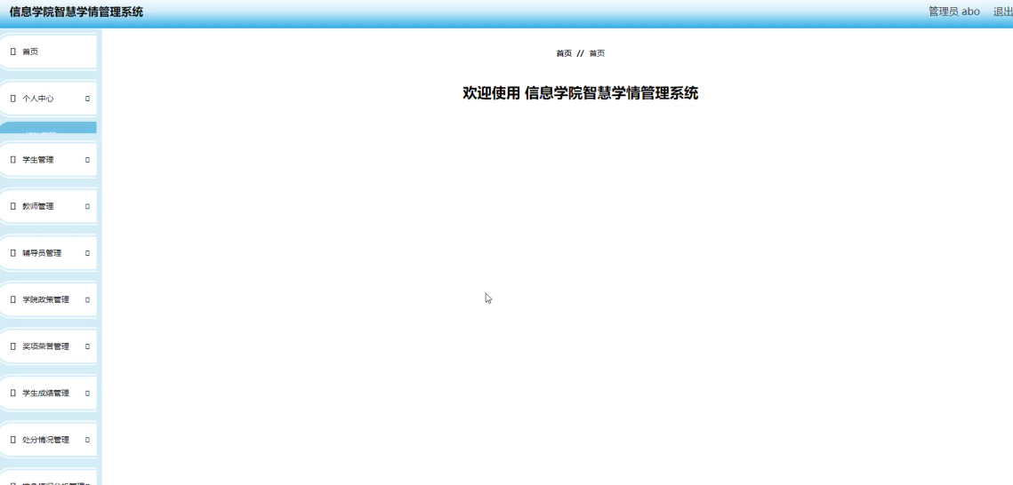 项目功能:学生,教师,辅导员,学院政策,奖项荣誉,学生成绩,处分情况,推免情况分析,预警情况分析,班级学情,专业学情,年级学情,导师带教学生学情