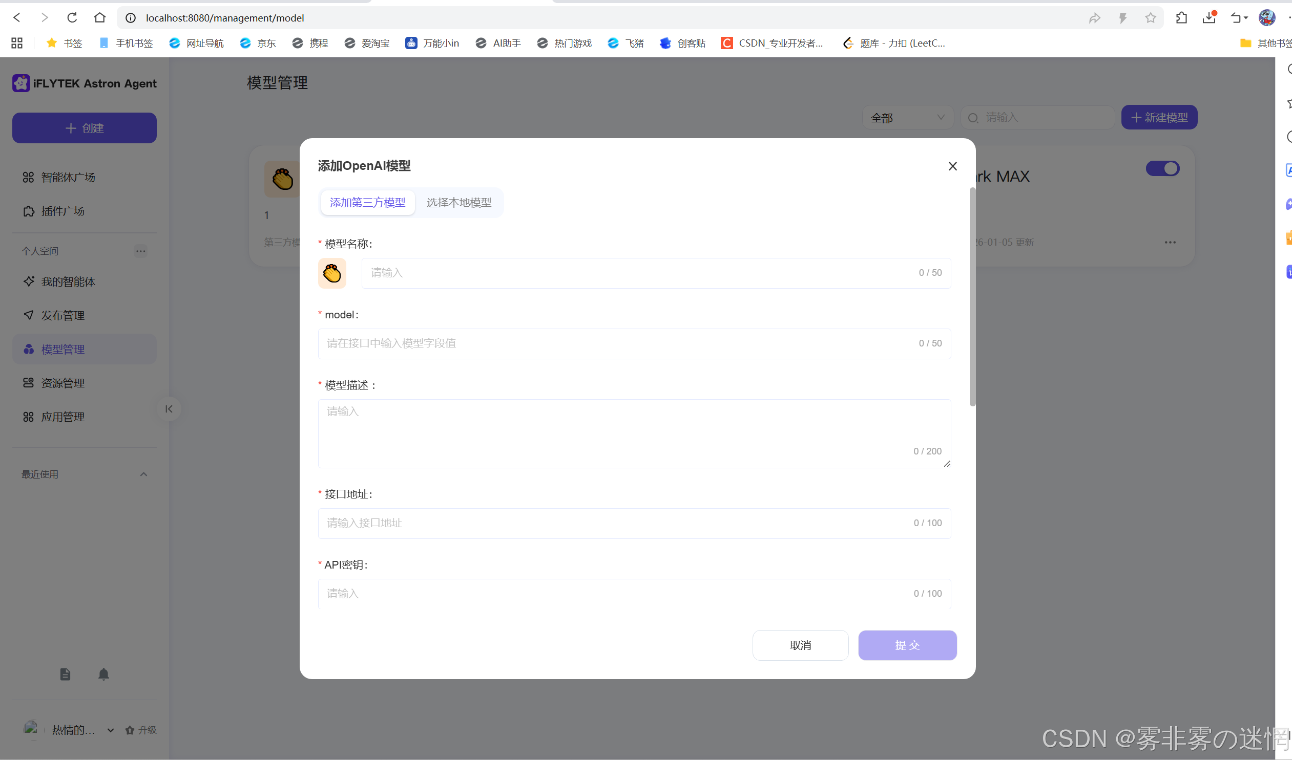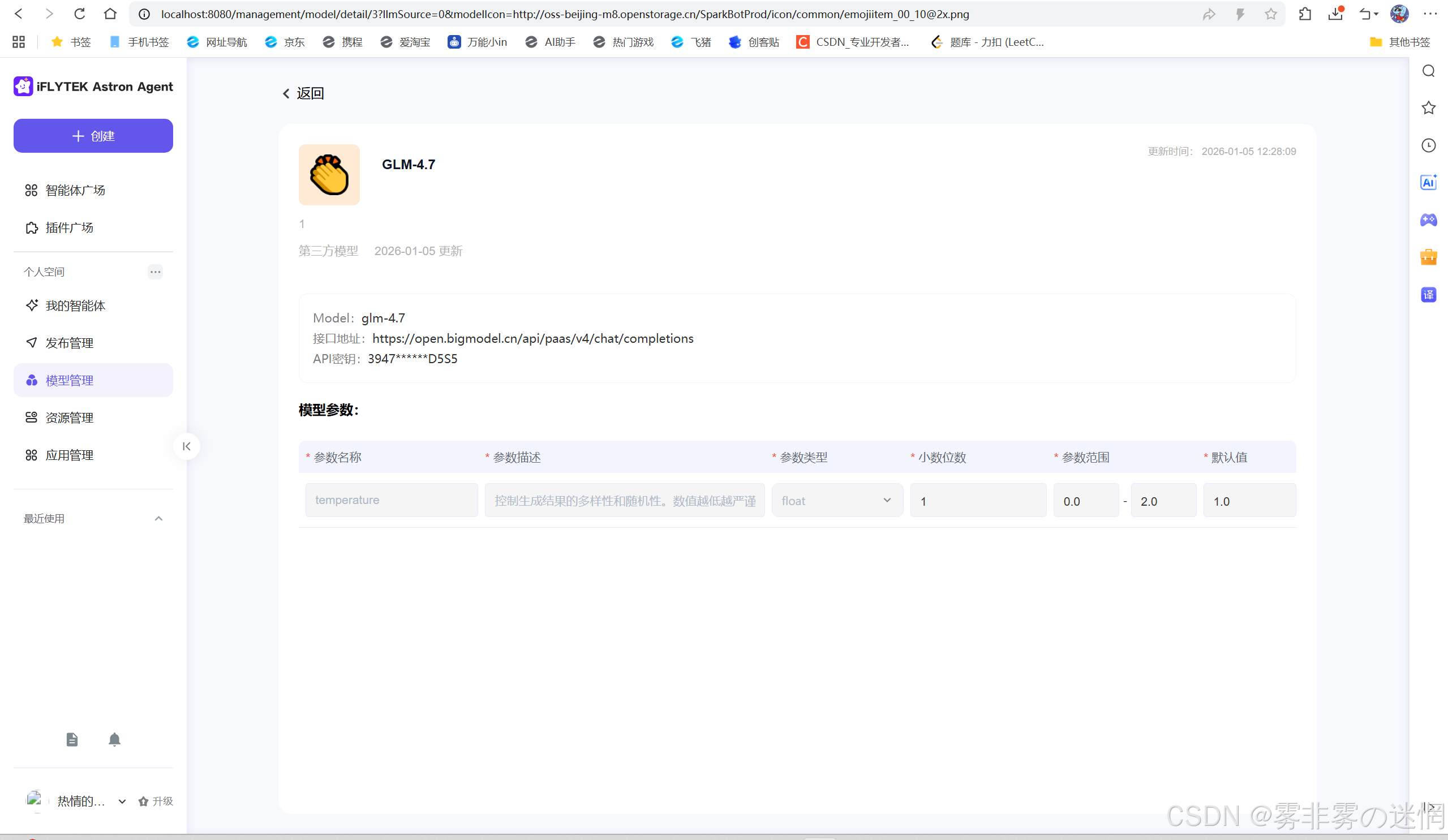 点击添加模型,以第三方为例,我这里选择的是智谱平台的GLM 4.7: