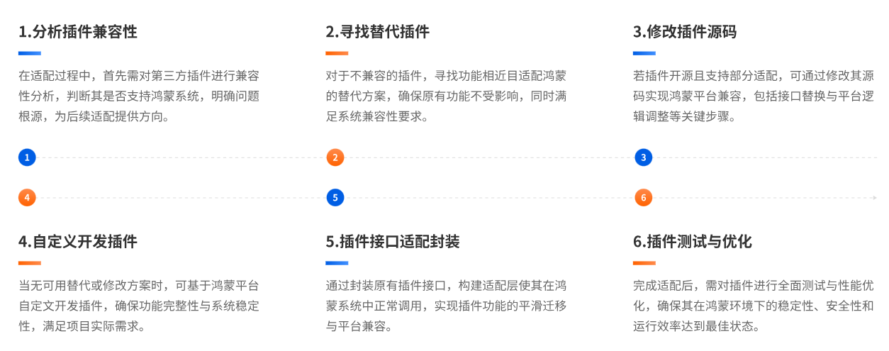 面对适配的复杂性,深德科推出 “Flutter 应用鸿蒙化五步法”,让适配流程有章可循。第一步前期准备与环境搭建,安装 DevEco Studio、配置鸿蒙版 Flutter SDK,完成项目兼容性评估;第二步三方插件鸿蒙化适配,替换或修改不兼容插件;第三步自定义插件鸿蒙化开发,用 ArkTS 语言重写插件并生成鸿蒙化插件包;第四步鸿蒙项目 Flutter 功能集成,创建新鸿蒙主工程并集成各类模块;第五步调试与测试,通过真机与模拟器双重验证保障稳定性。针对插件适配这一难点,还独创 “六步解决法”(图2),从兼容性分析、寻找替代插件,到修改源码、自定义开发,再到接口封装与测试优化,全方位确保插件功能稳定迁移。