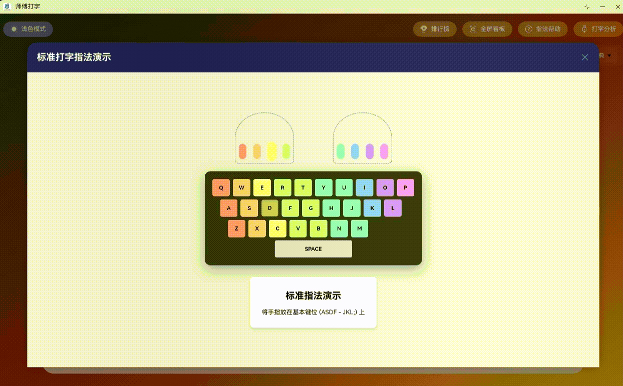 指法引导引擎:内置标准盲打指法映射规则,实时检测用户击键手指匹配度,输出动态矫正提示,支持从非标准指法(二指禅)到专业盲打的阶梯式进阶训练。