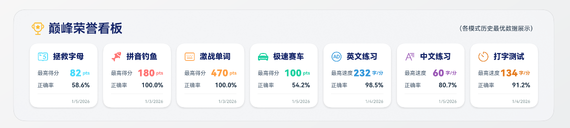 核心能力:支持英文录入训练、中文拼音录入训练、打字速度基准测试 三大核心场景。