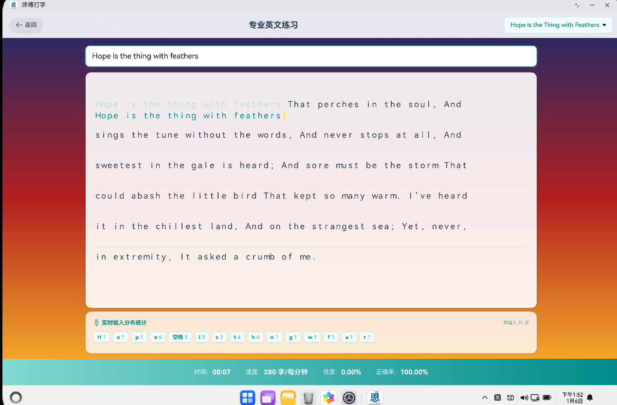 实时指标统计:运行时实时计算并输出 WPM(每分钟输入字数)、字符准确率、有效练习时长等核心量化指标,数据采样粒度为单次按键事件。