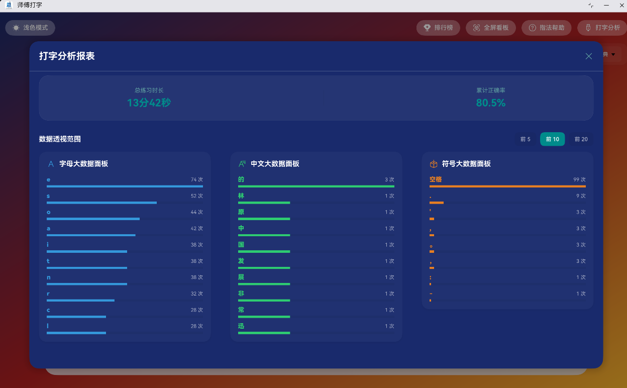 输入了多少次字母,文字输入多少次,符号输入多少次,都被我记录了,你经常打的内容都有记录,还有总练习时长,累计正确率(算平均值)。
