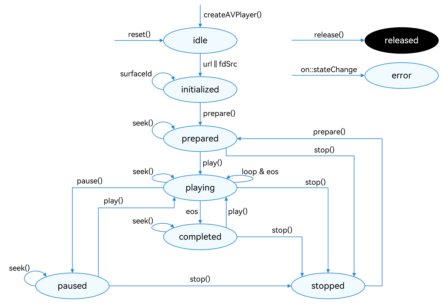 当播放处于prepared/playing/paused/completed状态时,播放引擎处于工作状态,会占用大量内存。不用的时候一定要调用reset()或release()释放资源,就像看完电影要关机一样!