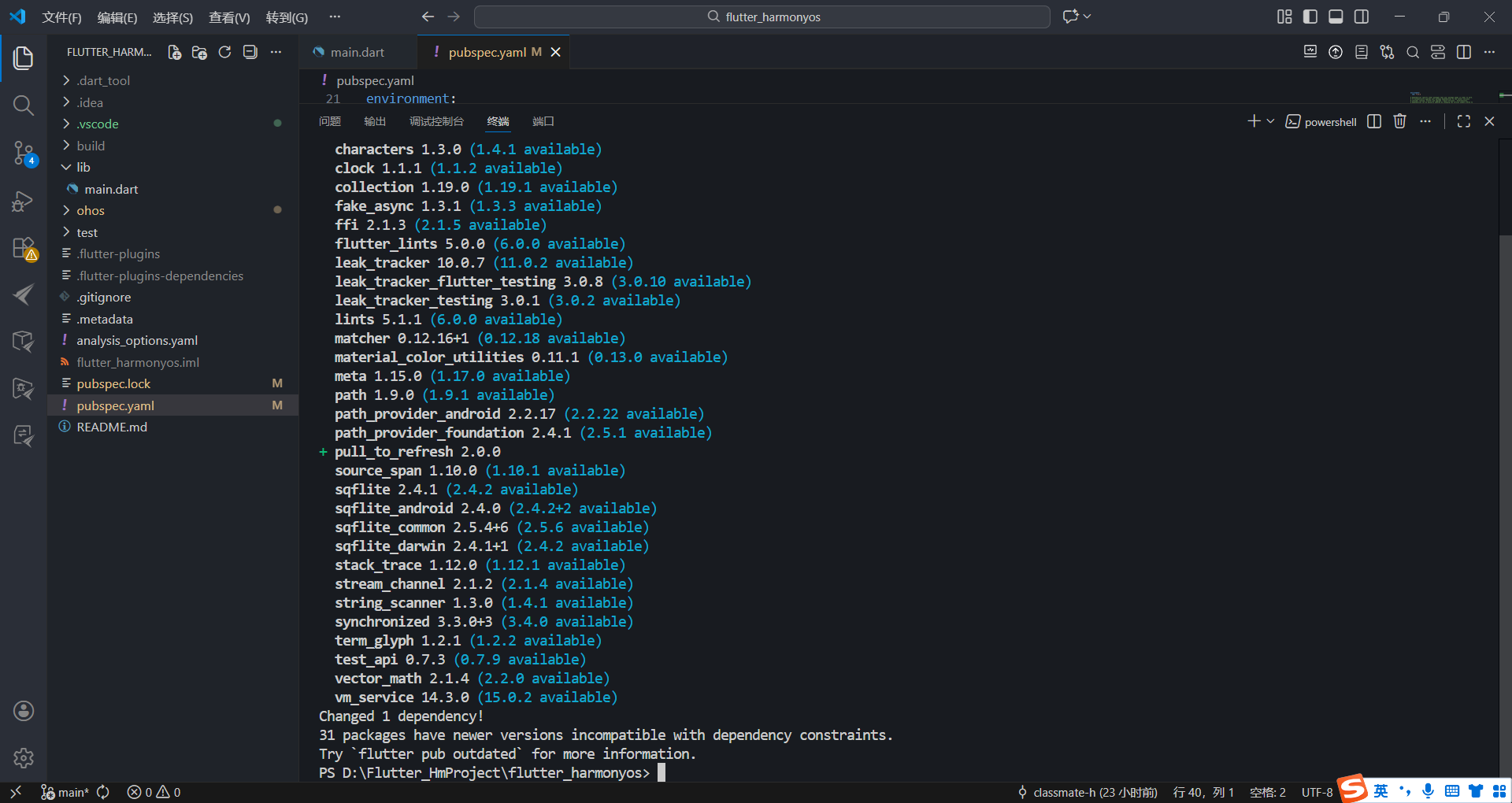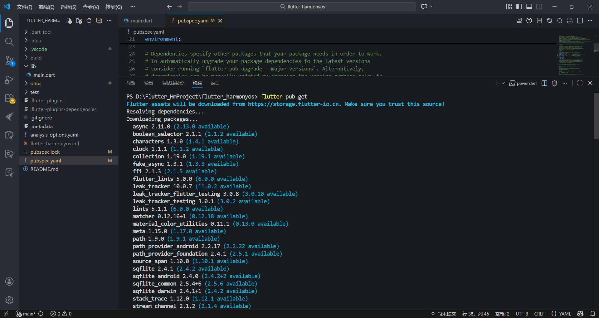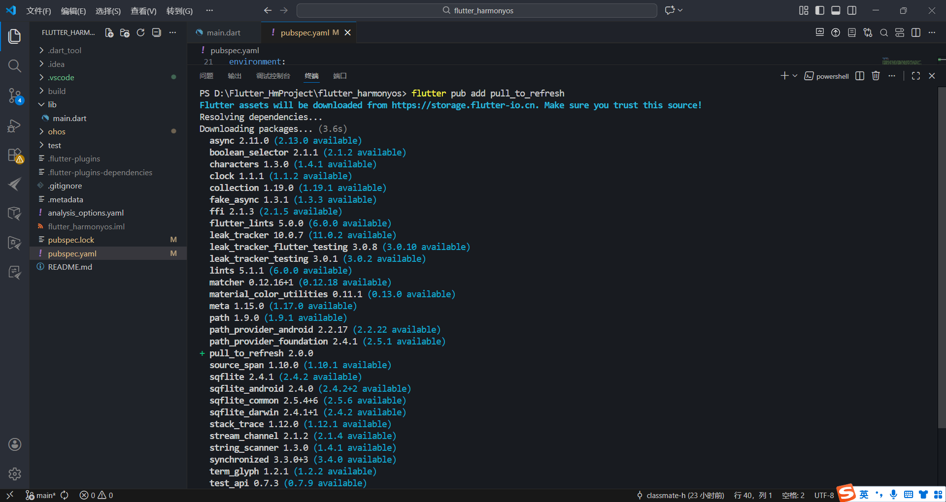 依赖生效:执行 flutter pub get 命令确保无鸿蒙适配报错。