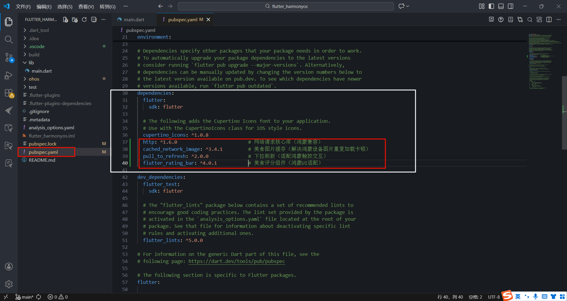 通过VS Code软件完成pubspec.yaml 新增美食场景专属依赖。