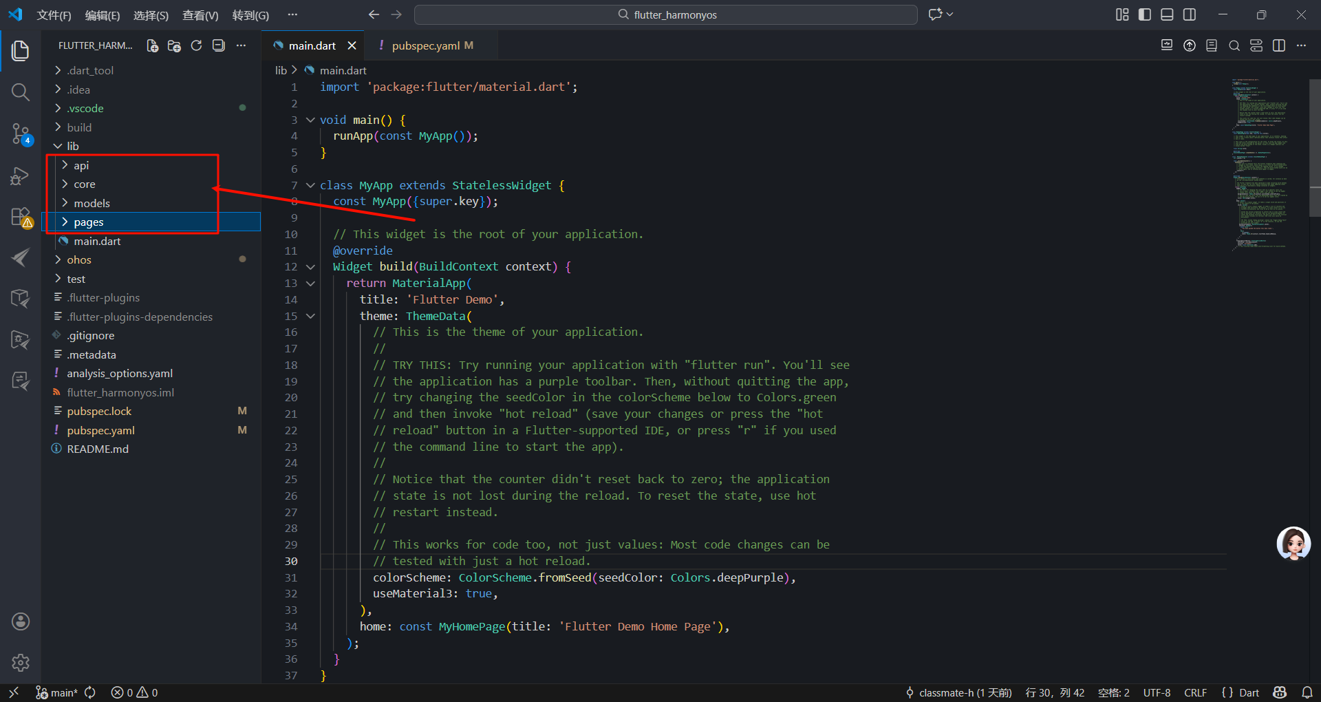 在 main.dart 中配置美食页面为入口(或路由),设置美食清单页面为应用首页,配置主题样式: