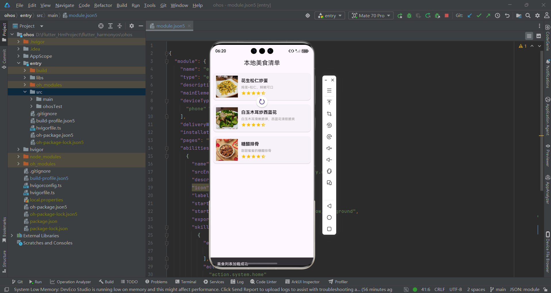 基于开源鸿蒙跨平台工程(Flutter+OpenHarmony) 开发“本地美食数据清单”页面。