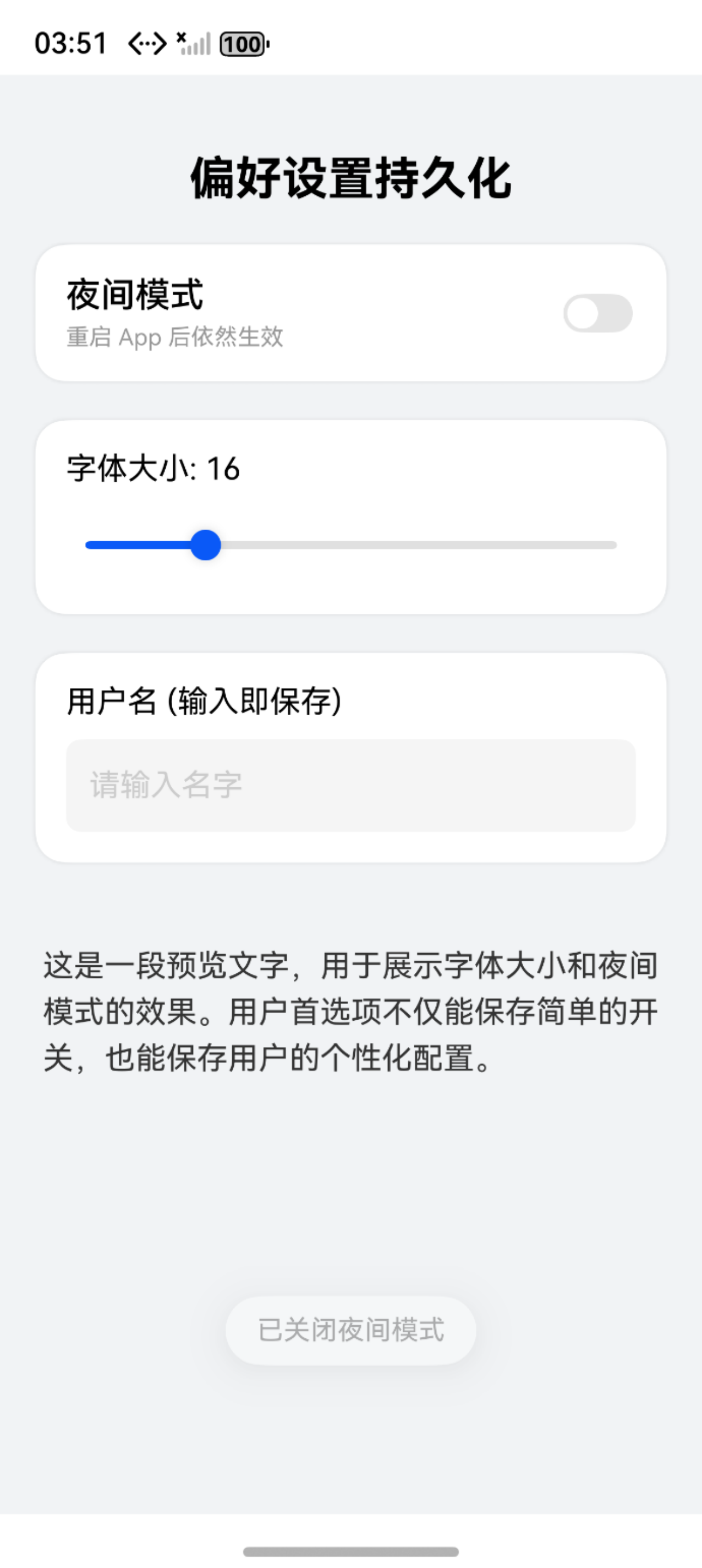 Text('这是一段预览文字,用于展示字体大小和夜间模式的效果。用户首选项不仅能保存简单的开关,也能保存用户的个性化配置。')