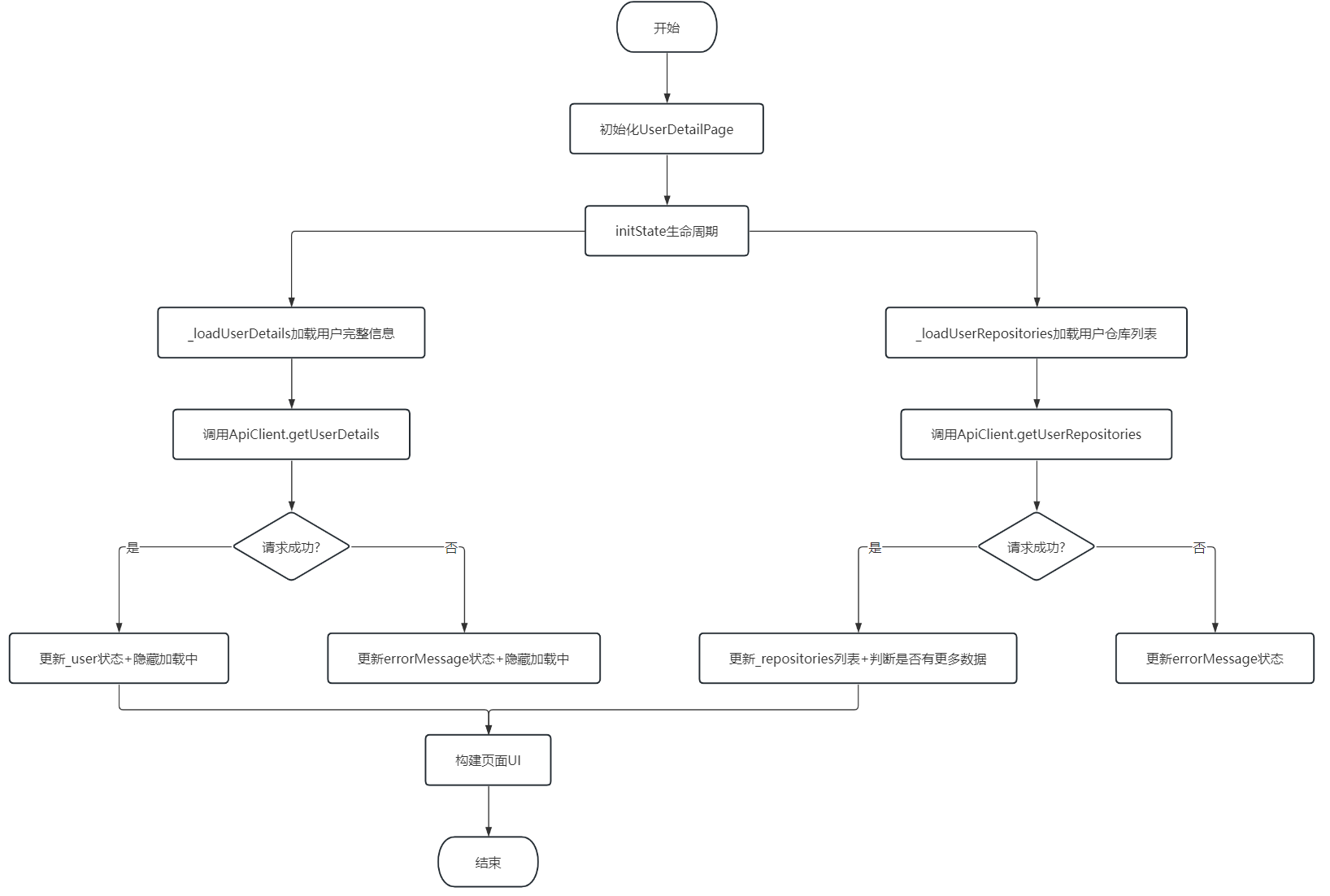 用户详情页为有状态组件(StatefulWidget),需主动请求接口加载数据,且支持分页加载仓库,流程如下: