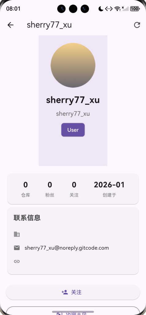 | 用户详情页 | 1. 加载并展示用户完整信息(头像、简介、公司 / 地址 / 邮箱等);2. 展示用户统计数据(仓库数、粉丝数、关注数);3. 分页加载用户公开仓库列表;4. 提供 “关注用户”“访问主页” 交互按钮;5. 支持刷新用户信息和仓库列表。 |