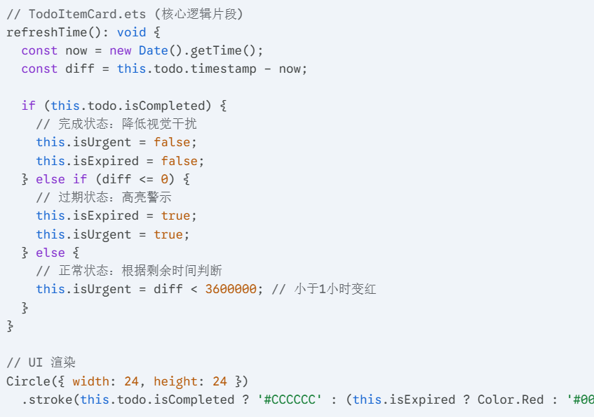 我利用 ArkUI 的状态驱动特性,将时间的紧迫程度映射为色彩。