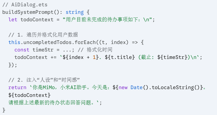 在我的 AiDialog 组件中,用户不需要重复输入自己的任务。系统会在后台默默地将当前的“待办清单”打包,变成 AI 的一部分记忆。
