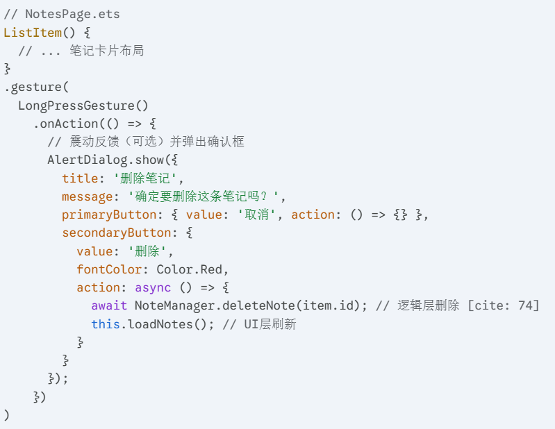 在设计“删除笔记”这个功能时,我本可以在卡片上放一个显眼的垃圾桶图标。但这既占空间,又容易误触。我选择尊重用户在微信、系统备忘录等主流软件中养成的习惯:长按唤出菜单。