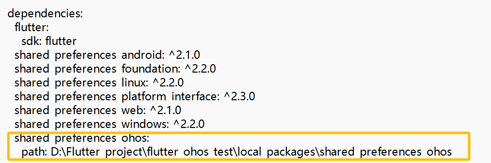 打开鸿蒙shared_preferences根目录 pubspec.yaml 文件,替换为本地路径依赖配置