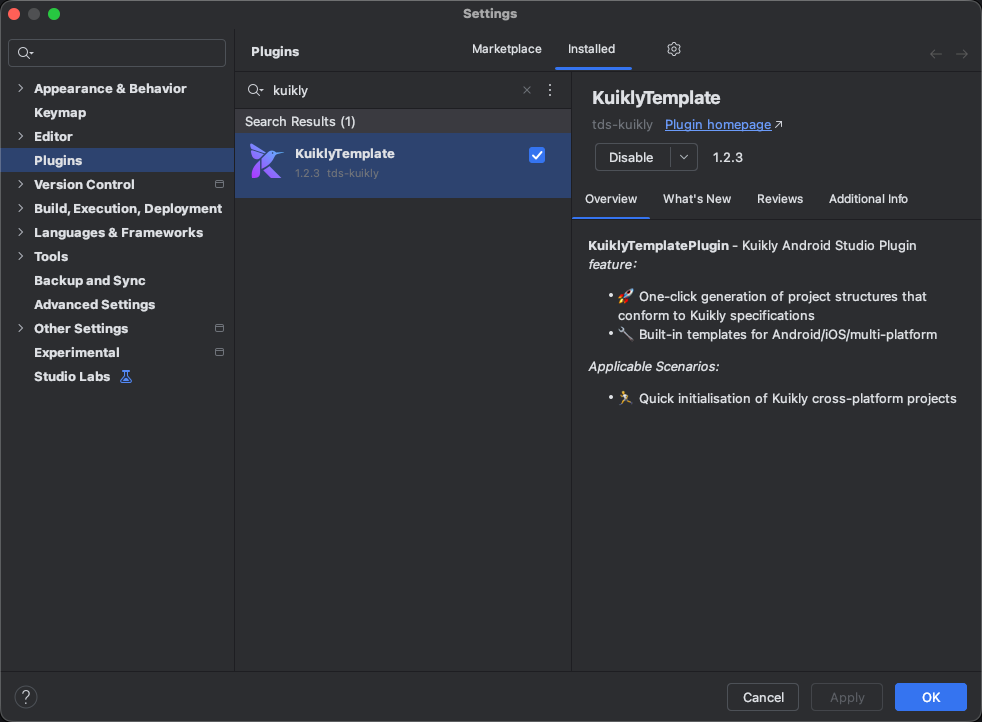 - 在 Android Studio 插件市场搜索并安装 KuiklyTemplate 插件。