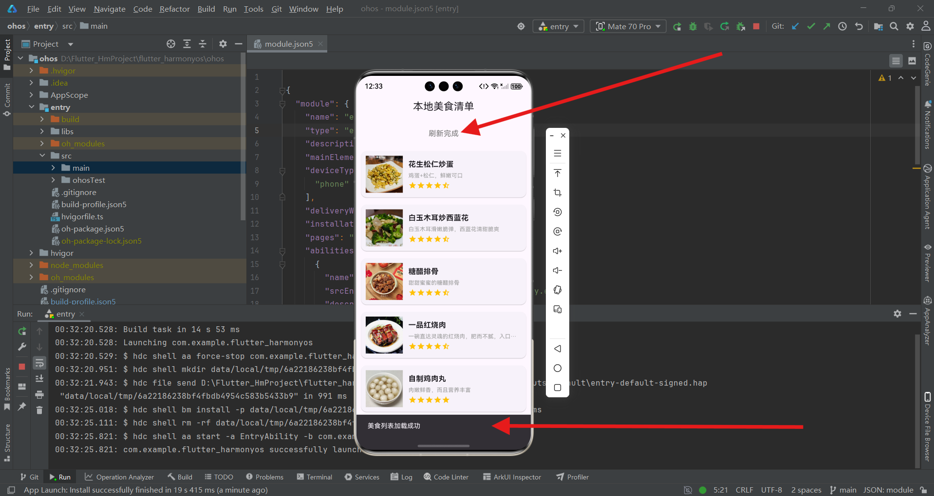 开源鸿蒙跨平台开发先锋训练营第一阶段通过7天递进式任务,构建从环境搭建到功能实现的技术体系。本人在开源鸿蒙跨平台开发先锋训练营第一阶段(DAY1~DAY6)中主要围绕“Flutter + 开源鸿蒙跨平台本地美食清单”应用展开,完成从开发环境搭建、核心功能实现到交互体验优化的功能实现,覆盖环境配置、Dio网络请求集成、美食清单列表UI功能实现、下拉刷新与上拉加载分页机制交互、加载状态数据提示等跨平台开发核心环节。