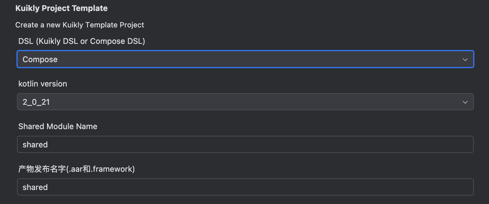 在配置页面的 DSL 选项中选择 Compose。选择 Kuikly 创建的就是Kuikly DSL项目。