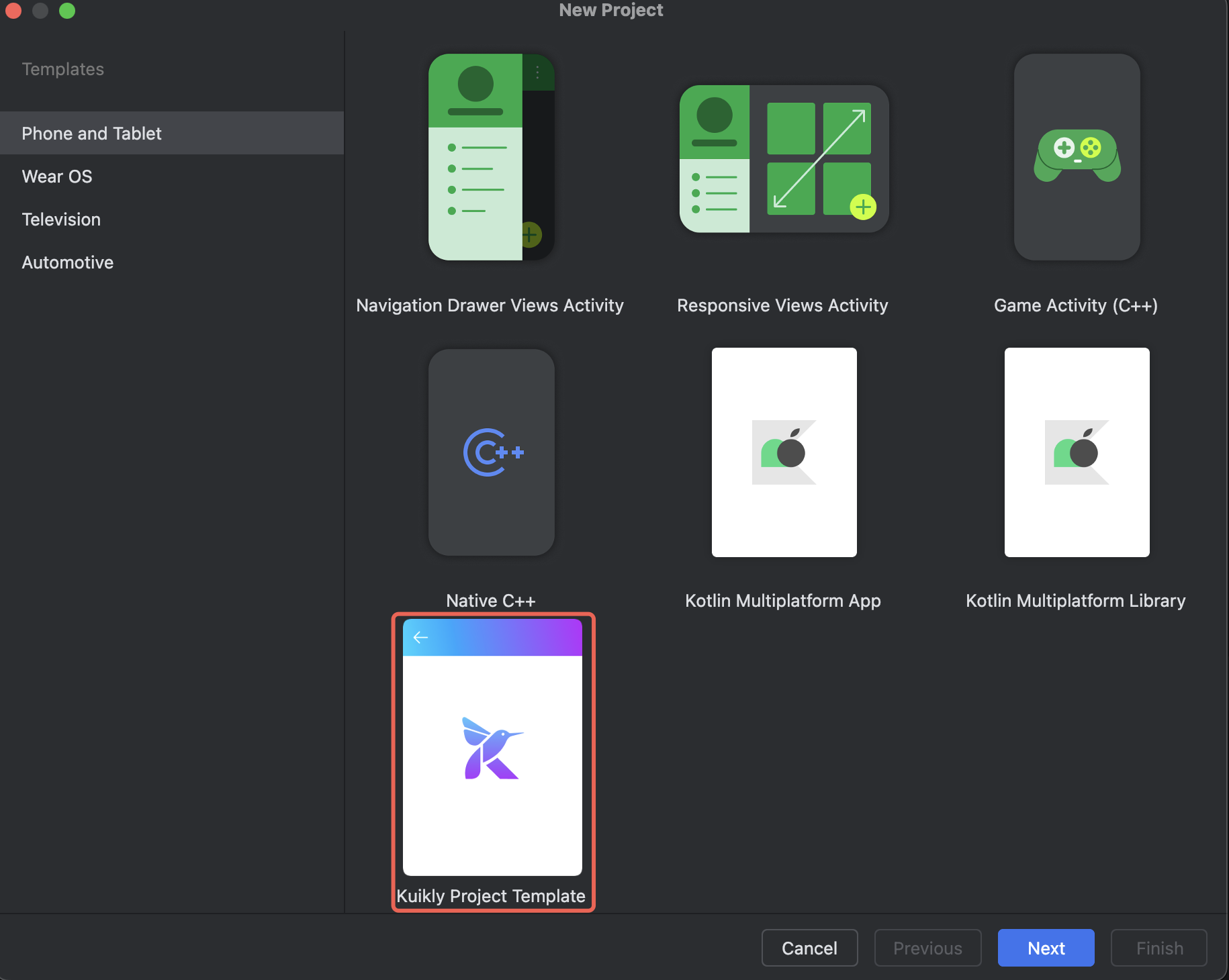 创建工程,并选择Kuikly project template (需要完成环境搭建中的ide插件安装)
