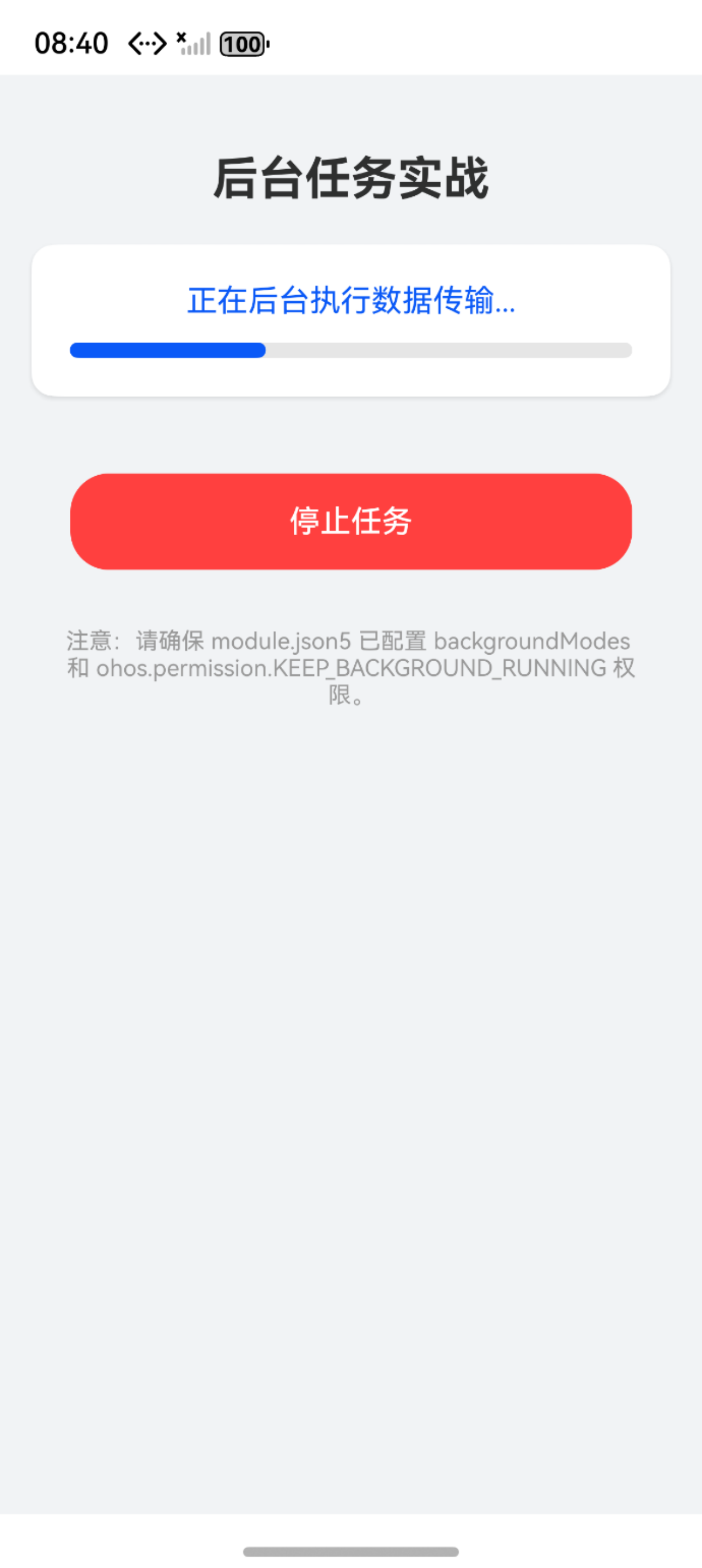 Text('注意:请确保 module.json5 已配置 backgroundModes 和 ohos.permission.KEEP_BACKGROUND_RUNNING 权限。')