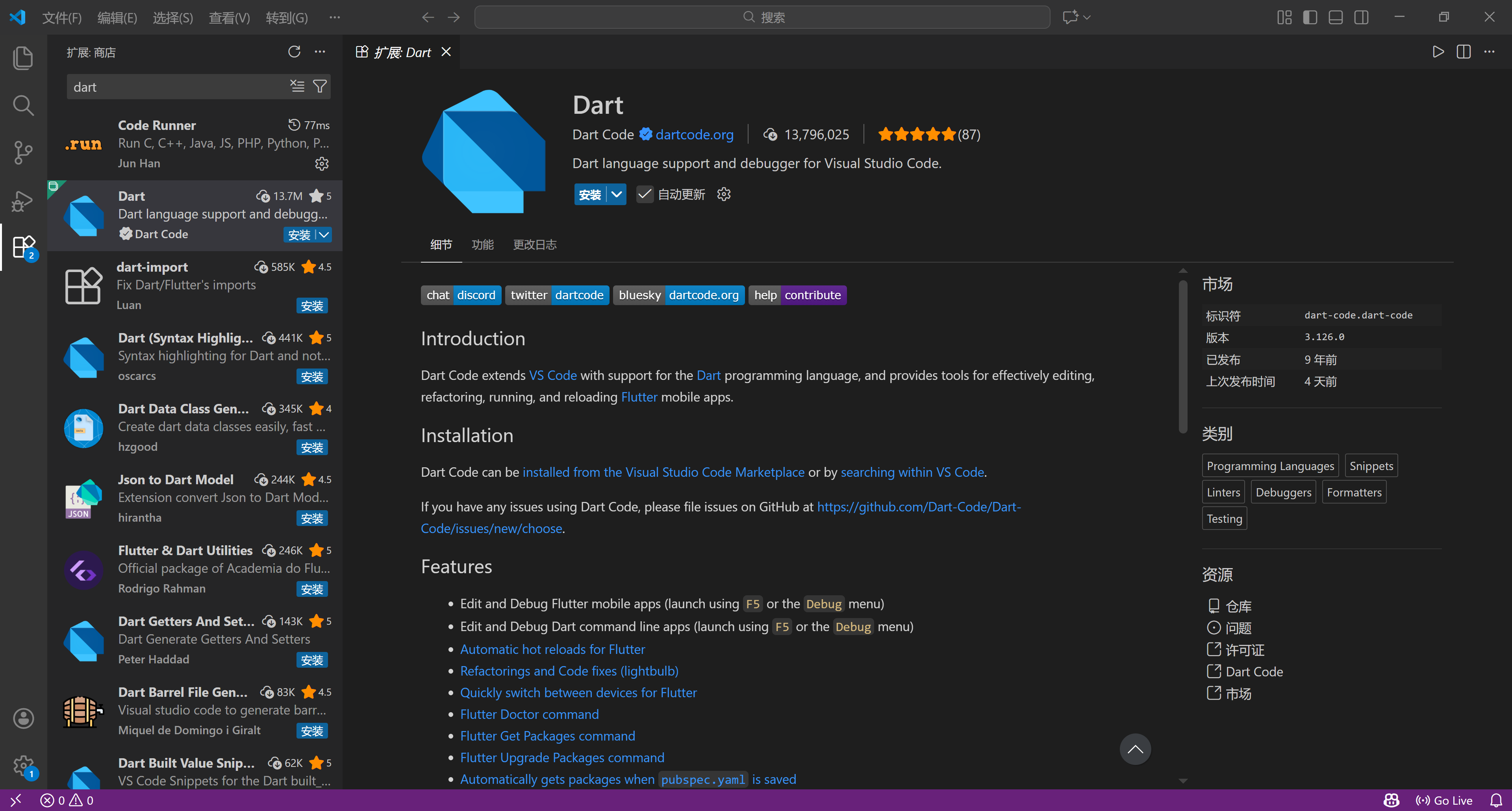 - Dart:提供 Dart 语言语法高亮、智能提示及编译支持;
