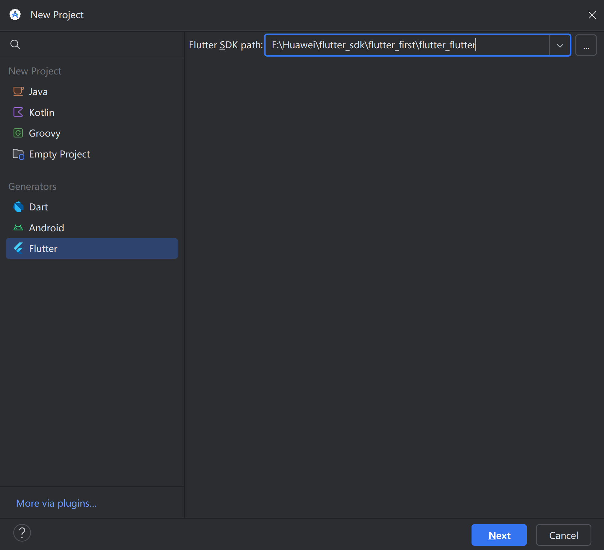在Android Studio创建Flutter项目。找到之前下载的flutter_sdk的路径。