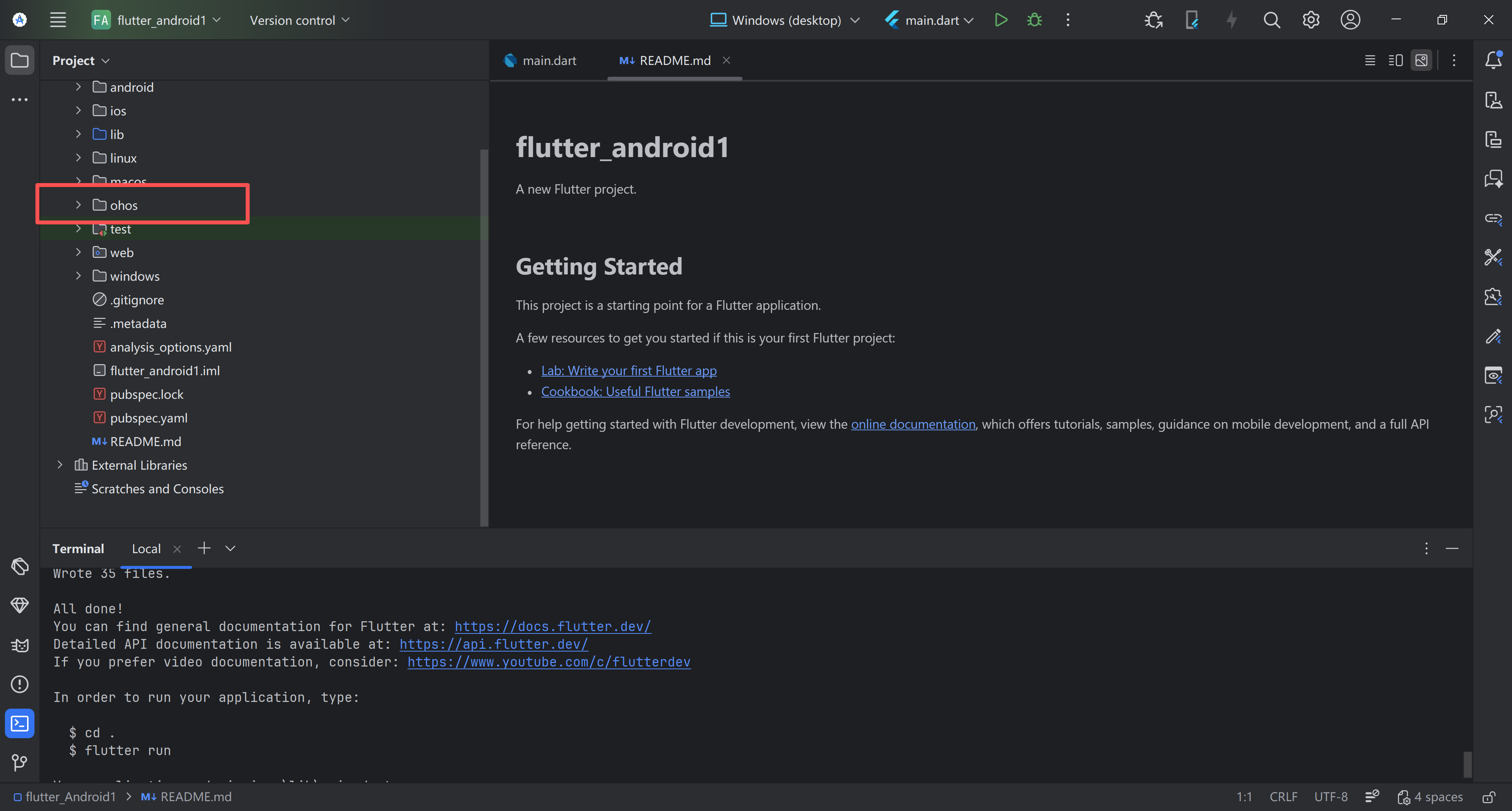 flutter create --platforms ohos .#在项目根目录生成 ohos 文件夹(“.”表示当前目录,不可省略)。
