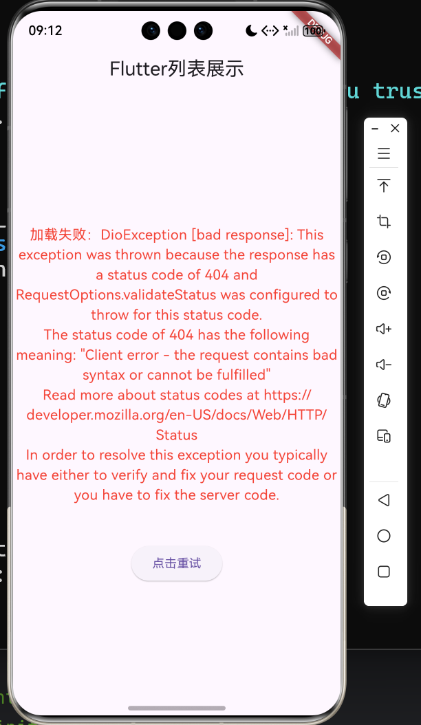 这一步没有需要详细说的只要记得保存即可,这里我的Flutter已经成功安装并且运行了,但是我的接口出现错误主要是我的代码测试接口出错,现在我需要修改我的接口使他更加稳定。下面是我要修改的代码: