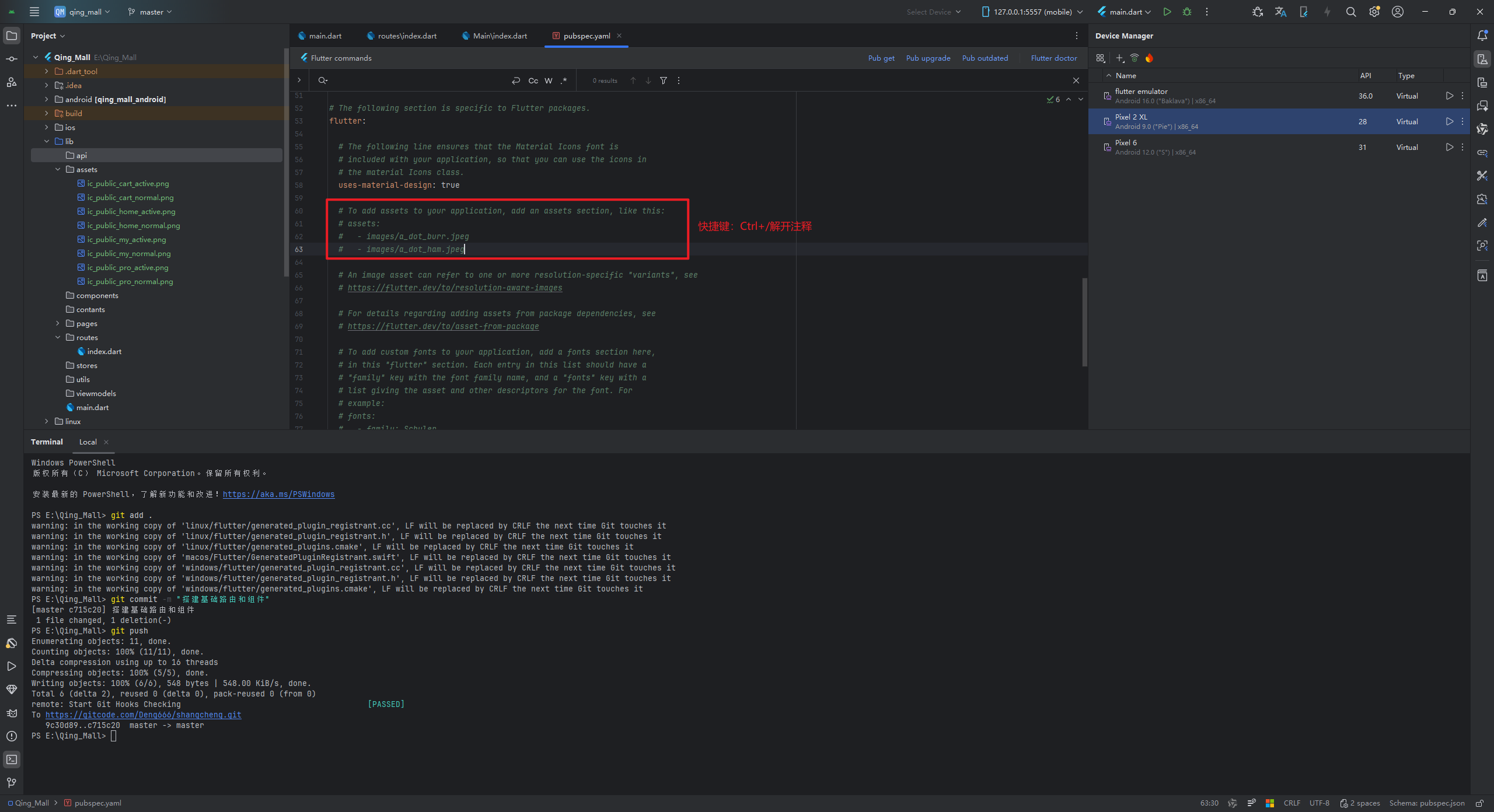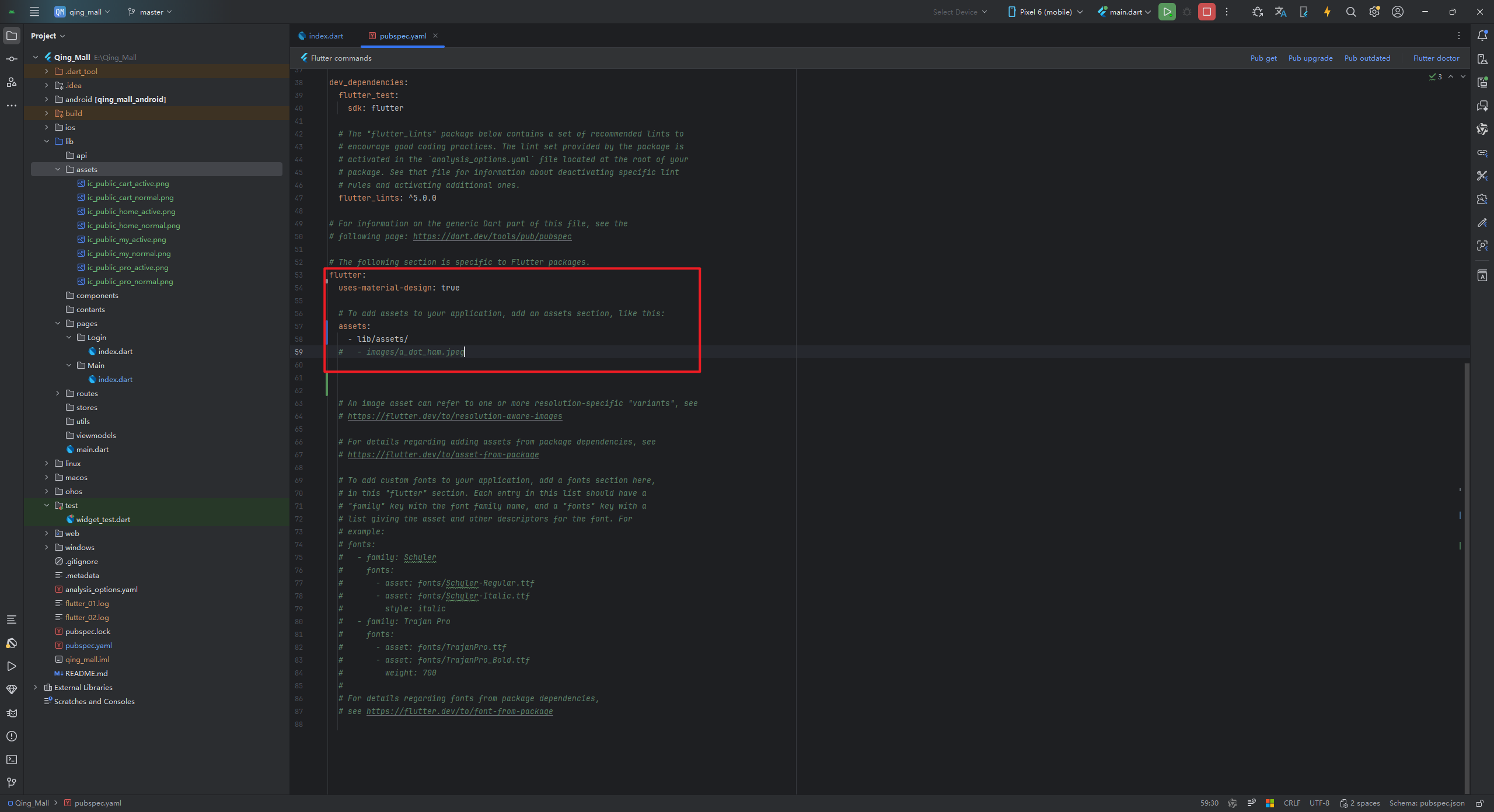改成如图所示,并且点击右上角的Pub get,如果不会改就复制粘贴以下代码:
