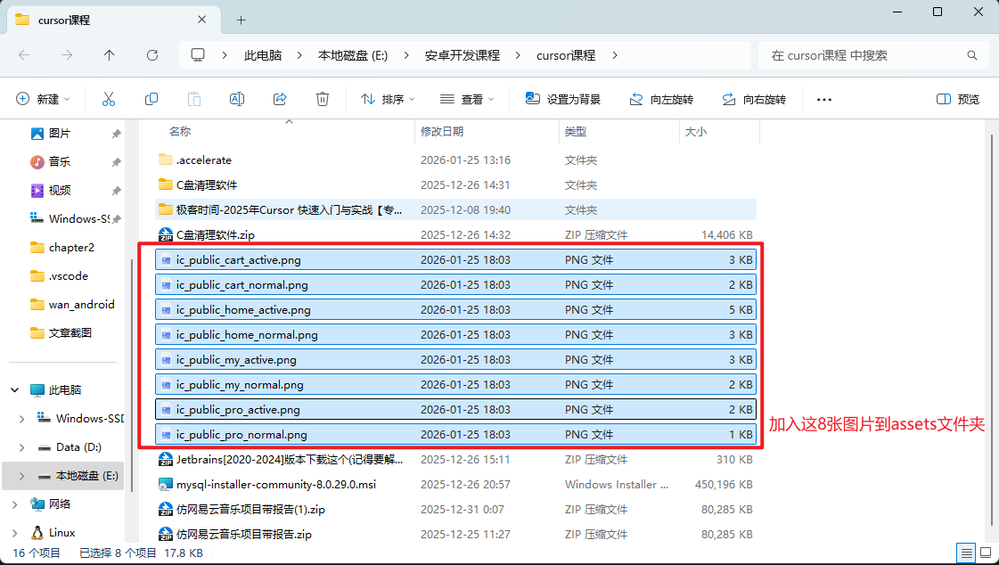 首先将文件夹中的八张图片拷贝,分别是底部导航栏的选中和未选中。复制粘贴到项目中的"assets"文件夹中。大家可以在我的代码仓库就获取这八张图片,顺便给我点个Star。
