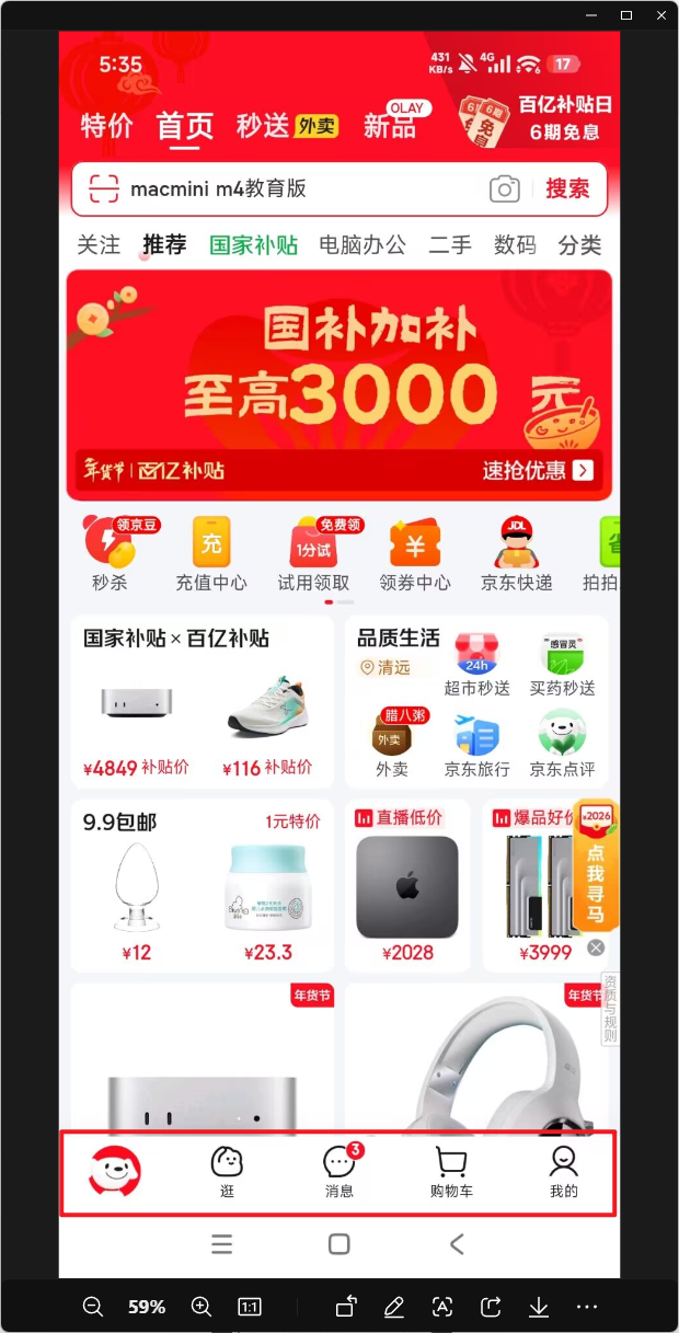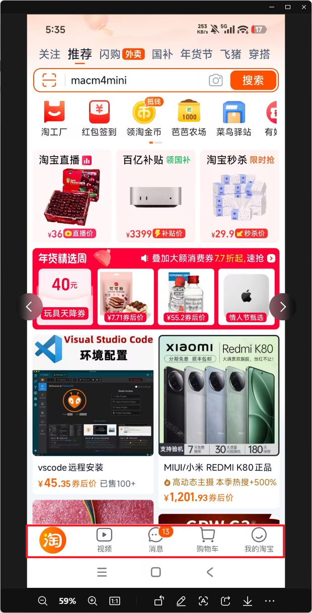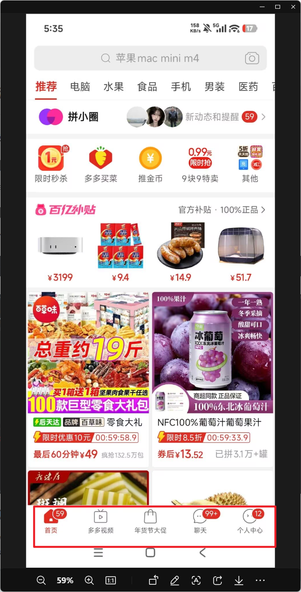 以常见的电商平台举例,如淘宝、京东、拼多多都有底部导航栏。本章节要实现的内容就是实现四个底部导航栏:首页、分类、购物车、我的。