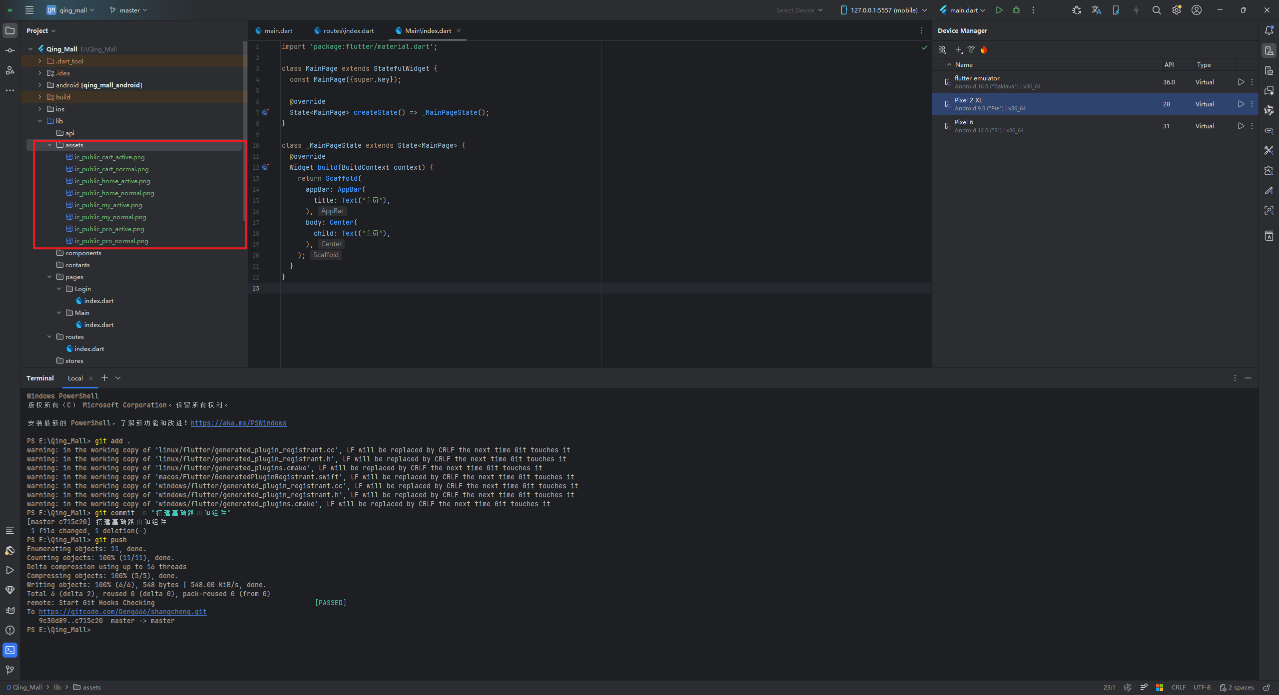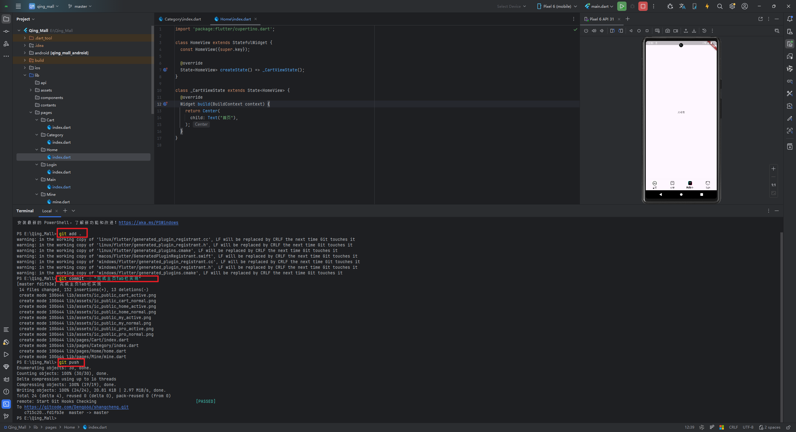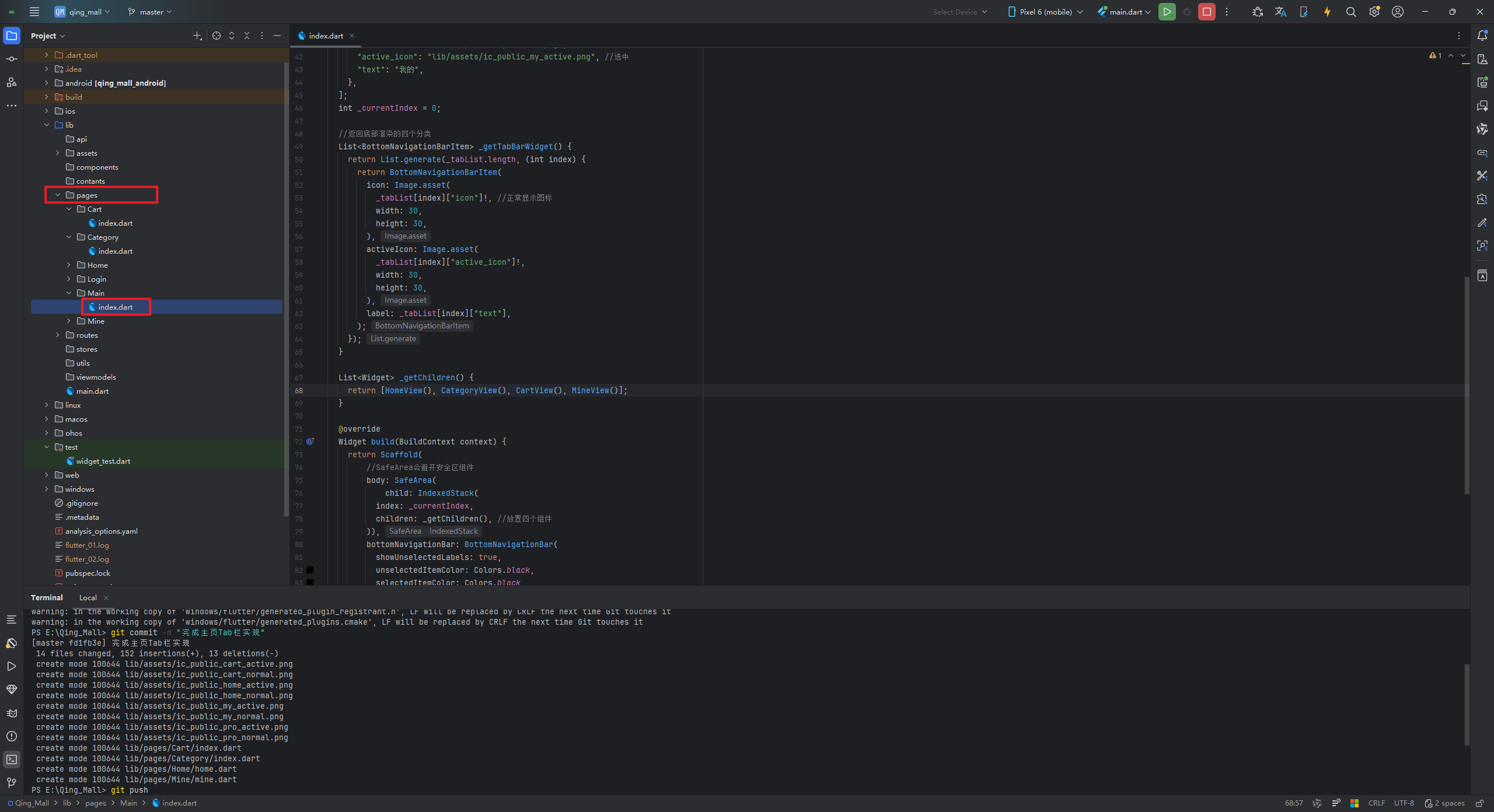 本文介绍了Flutter电商应用底部导航栏的实现过程。首先通过git回退代码到初始状态,然后分三步实现:1)基础Tab栏搭建,处理图片资源路径问题;2)添加导航交互逻辑,解决点击无效问题;3)优化为模块化结构,使用IndexedStack保持页面状态,并适配安全区域。最终实现了包含首页、分类、购物车和个人中心四个模块的底部导航功能,在安卓和鸿蒙系统上均运行正常。代码采用状态管理控制当前选中索引,并