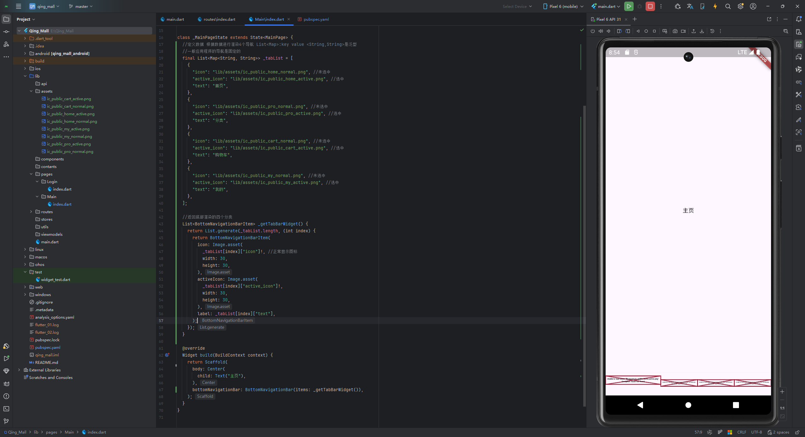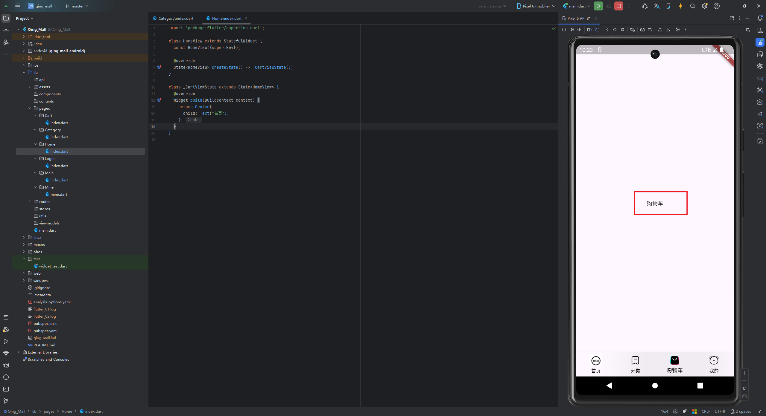 最终的运行效果是点击底部导航栏对应的Tab显示对应的内容,比如点击我的就显示Mine/index.dart代码中的内容,点击购物车就显示Cart/index.dart代码中的的内容