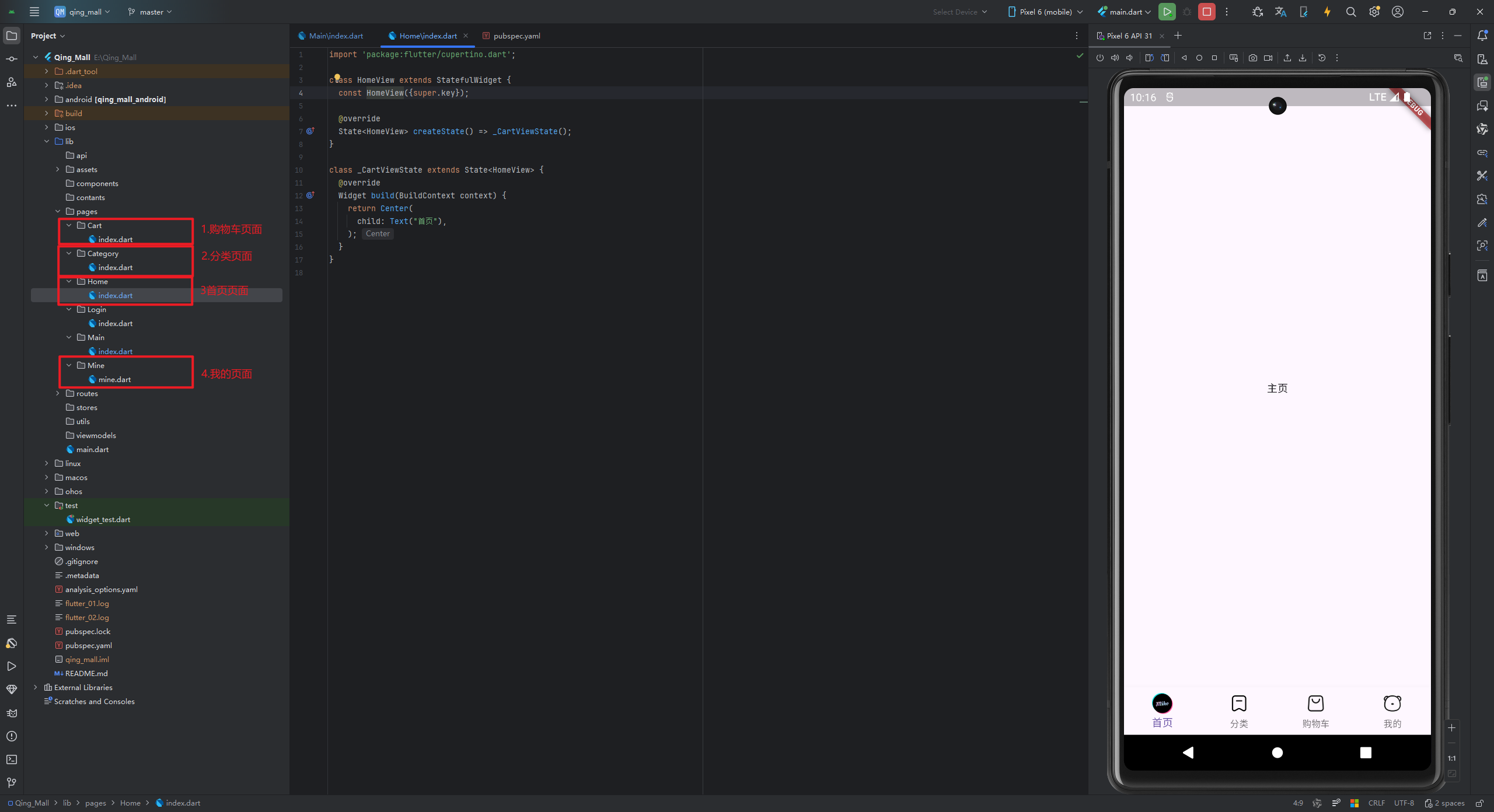 新建以下四个文件夹以及代码:Cart文件夹下的index.dart,Category文件夹下的index.dart,Home文件夹下的index.dart,Mine文件夹下的index.dart。