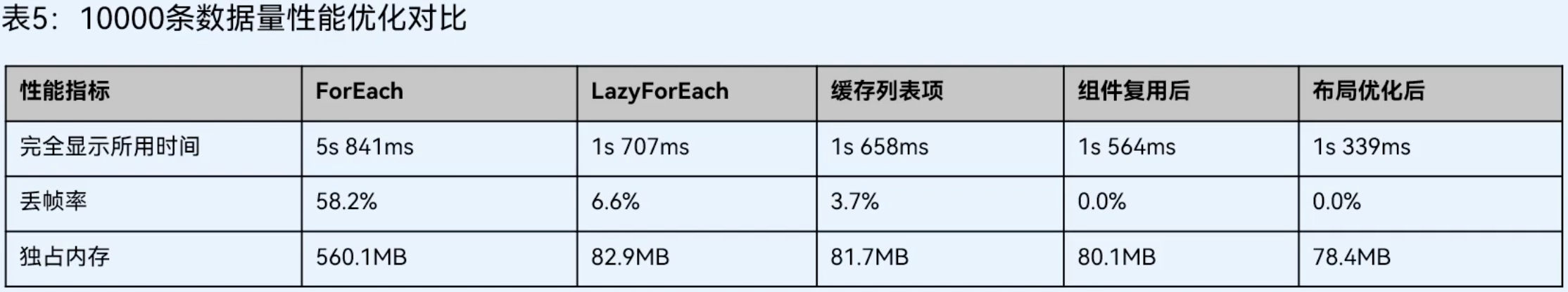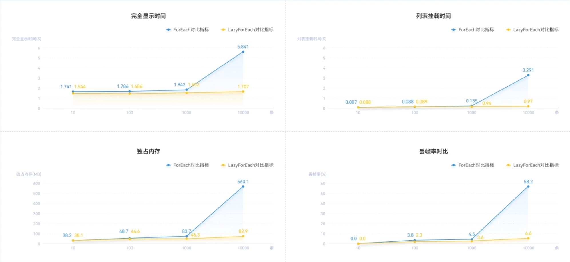 使用LazyForEach懒加载这项技术后,相比ForEach这种加载方式,在列表数据量较小(100条内)且数据一次性全量加载不是性能瓶颈时,两者各项性能指标差异不大。但当列表数据较长特别是达到10000条数据量后,ForEach的上述4项性能指标会有“指数级别”的显著劣化,滑动会出现明显的卡顿,甚至会出现应用crash等现象;而LazyForEach因为采用了懒加载技术能明显减少首屏完全显示所用