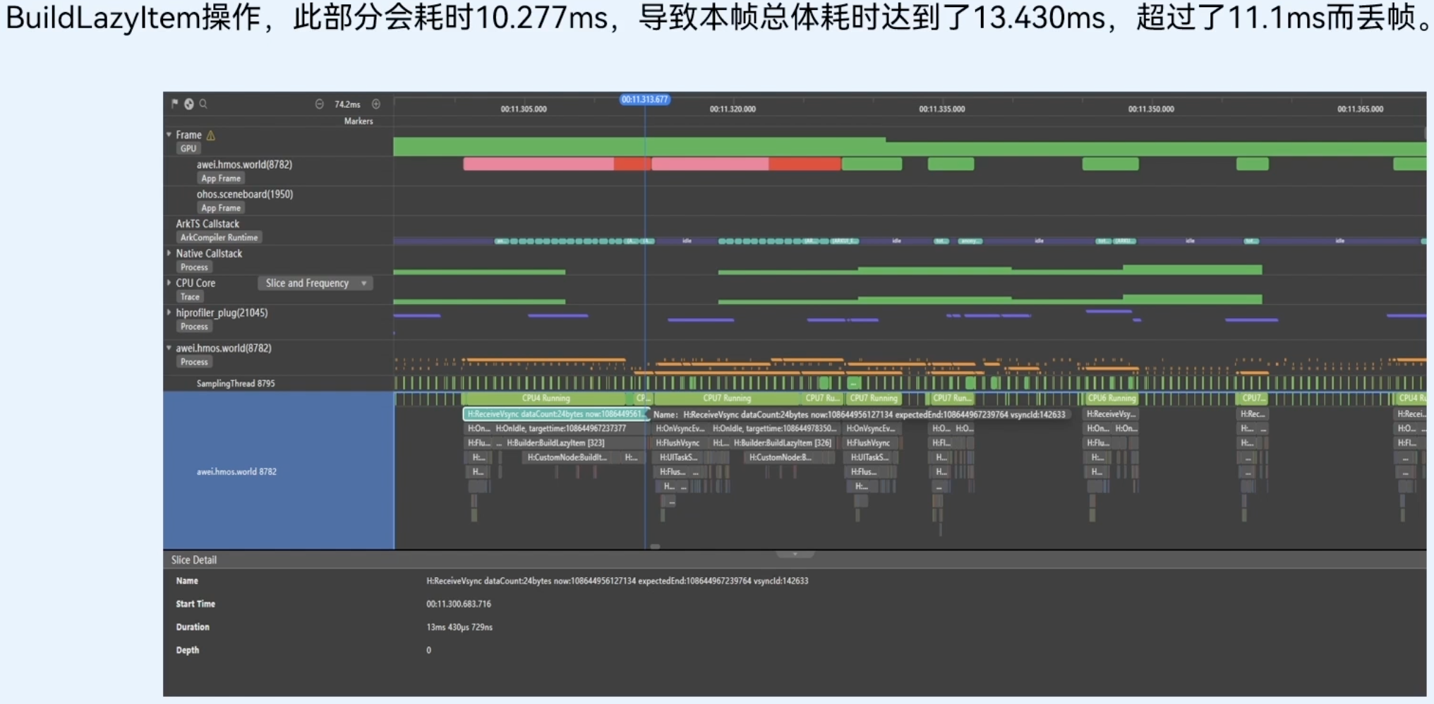 - 丢帧率(Janky Frames) :表示一个时间周期内的丢帧比率,是指一个时间周期内有问题的帧比例。HarmonyOS系统要求每一帧都要在11.1ms (90Hz刷新率)内绘制完成,如果页面没有在11.1ms内完成这一帧的绘制,就会出现丢帧。部分丢帧一般用户肉眼是感知不到的,只有出现连续丢帧用户才有明显感知。