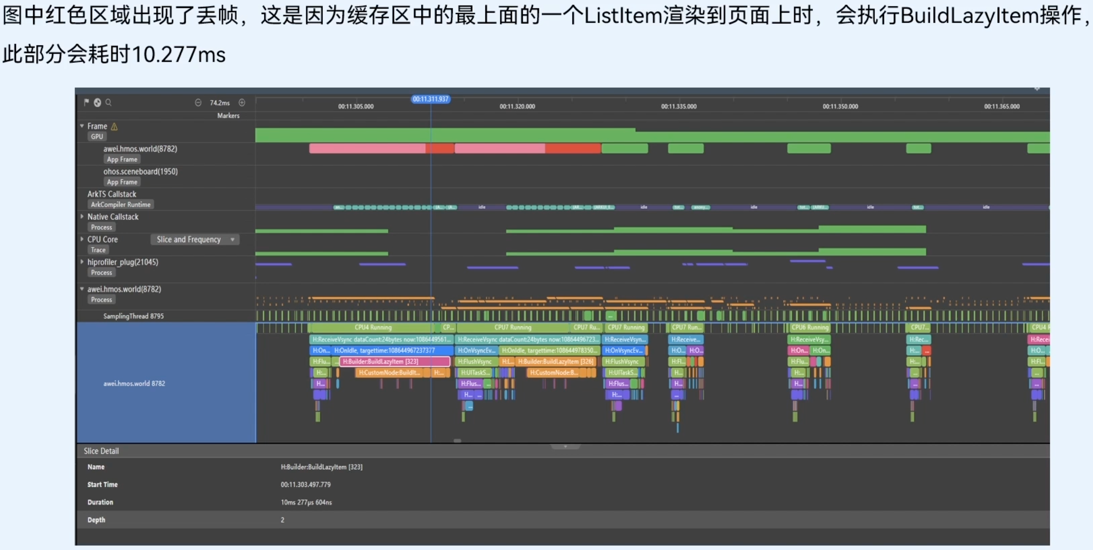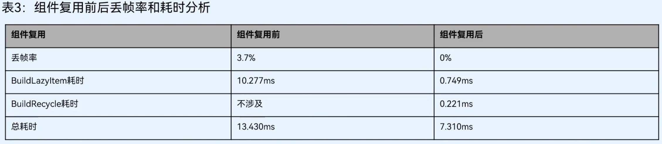List列表开启了组件复用,不会执行BuildLazyltem这个耗时操作(耗时10.277ms),后续创建新组件节点时,会直接复用缓存区中的节点(耗时0.97ms),这样就大幅节约了组件重新创建的时间。
