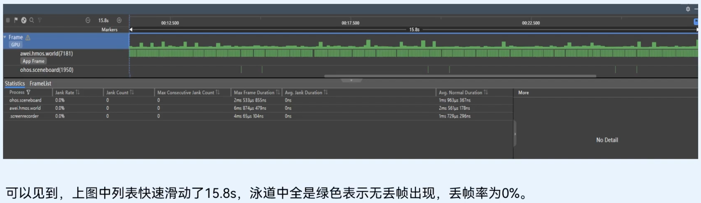 下面以“HarmonyOS世界”中首屏的长列表加载为例,对比分析如下三个关键指标: