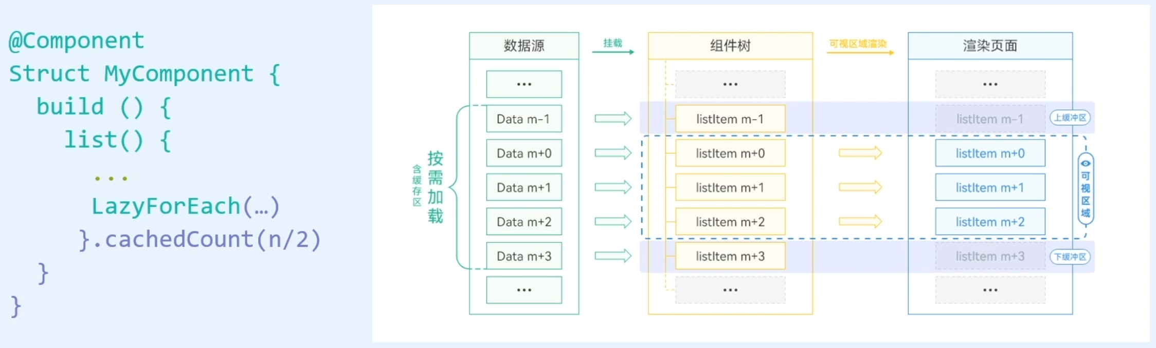 LazyForEach懒加载可以通过设置cachedCount来指定缓存数量,在设置cachedCount后,除屏幕内显示的Listltem组件外,还会预先将屏幕可视区外指定数量的列表项数据缓存。这样当一个屏幕数据加载完成后,再次向下滑动时,会先加载上一次请求的数据,加载完成后,再加载本次请求的数据。