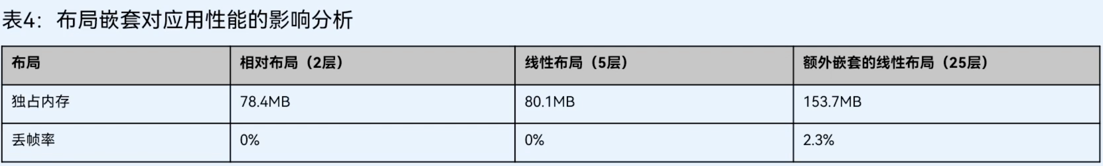布局过度嵌套会导致应用内存增加,且会影响应用的帧率导致丢帧增加,所以开发者在写列表这类循环组件的代码时,需要特别考虑对其布局进行优化。一般而言布局的最大嵌套层级控制在5-8层左右即可,过度的优化布局会导致代码开发难度加大,代码不易于阅读理解,增加后续的维护成本,不利于多设备的适配,且也不会带来特别显著的性能提升。