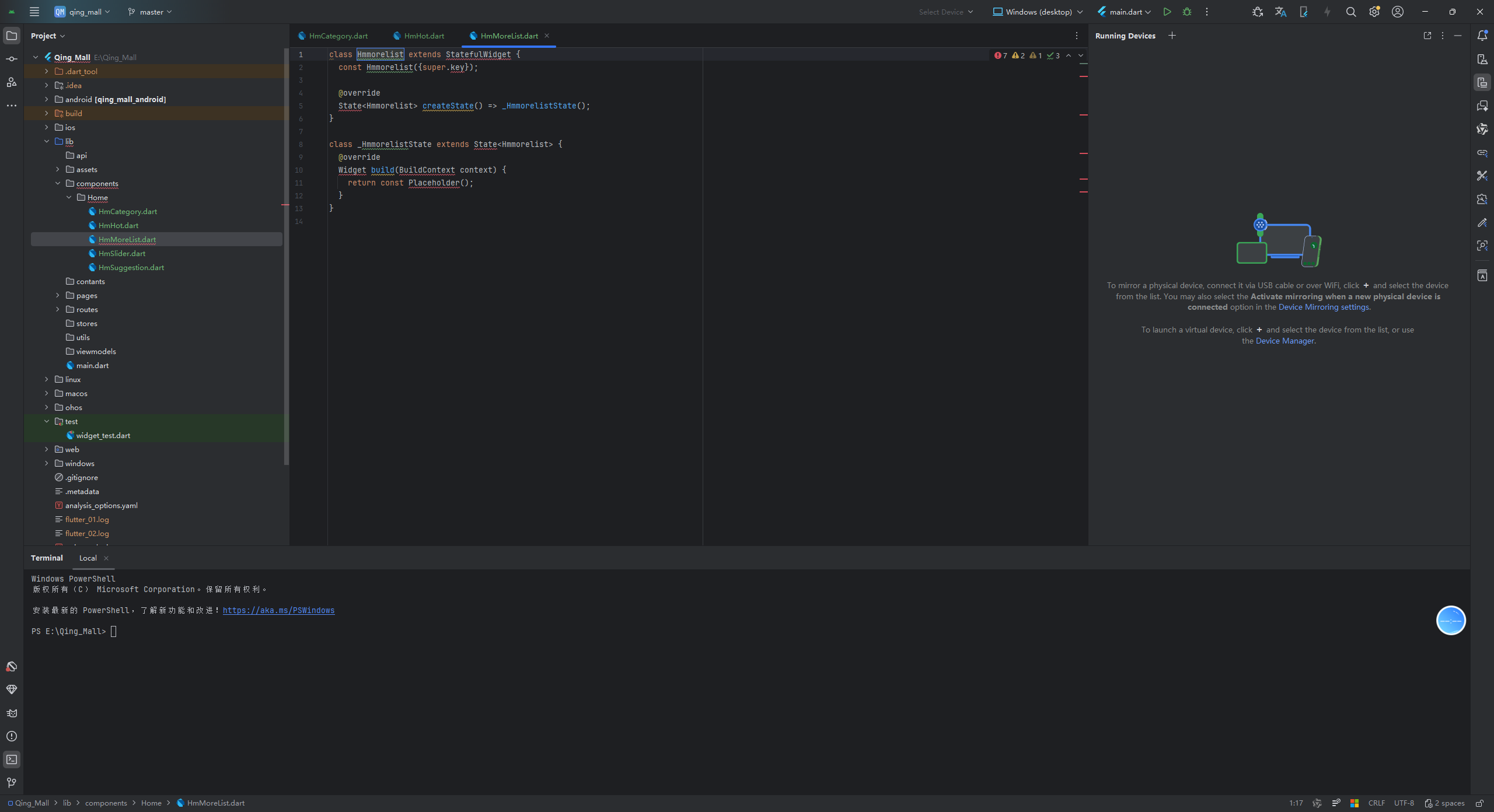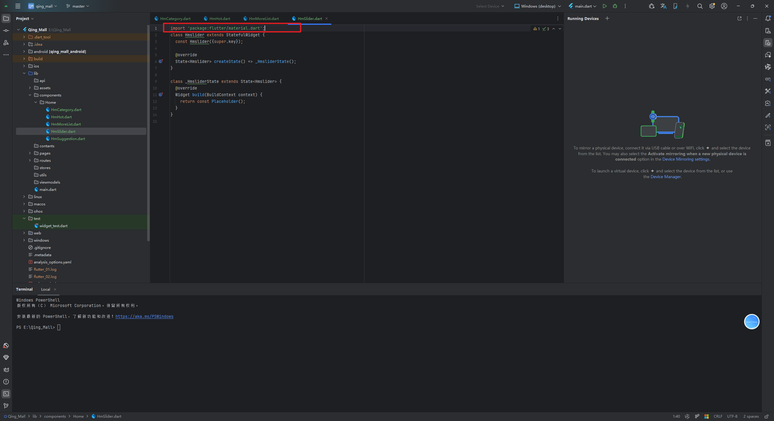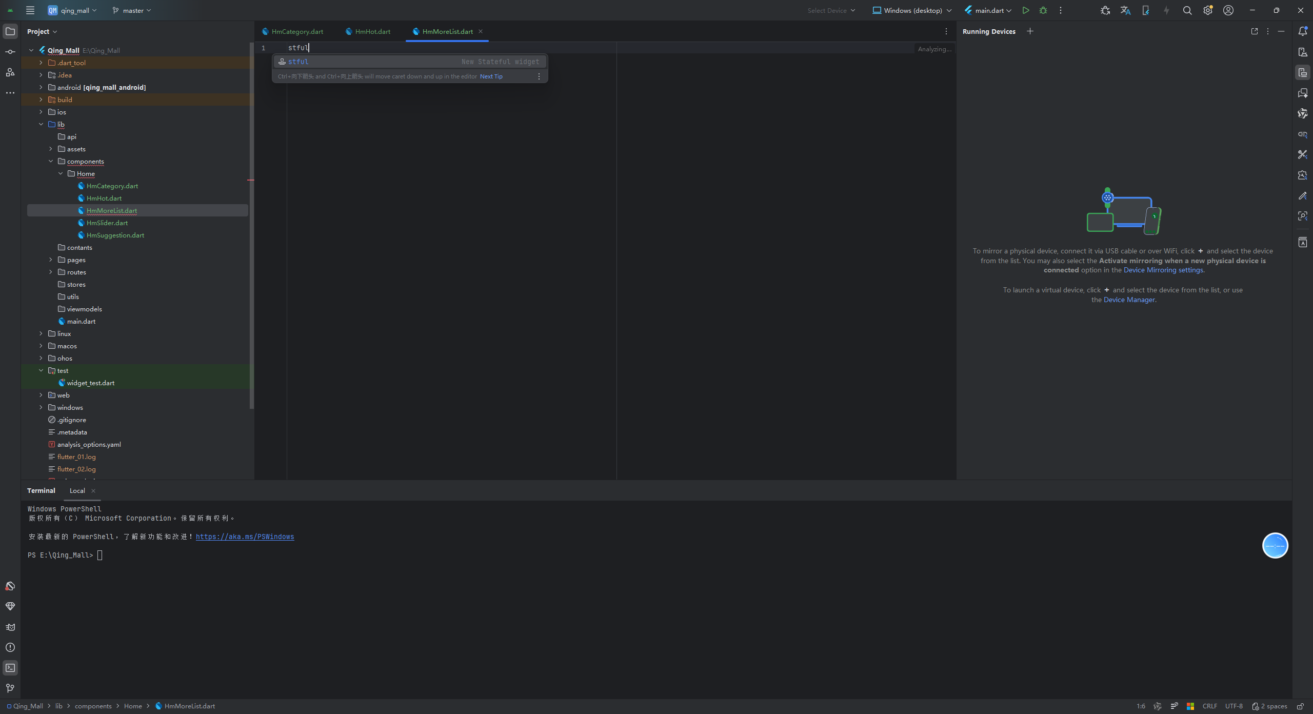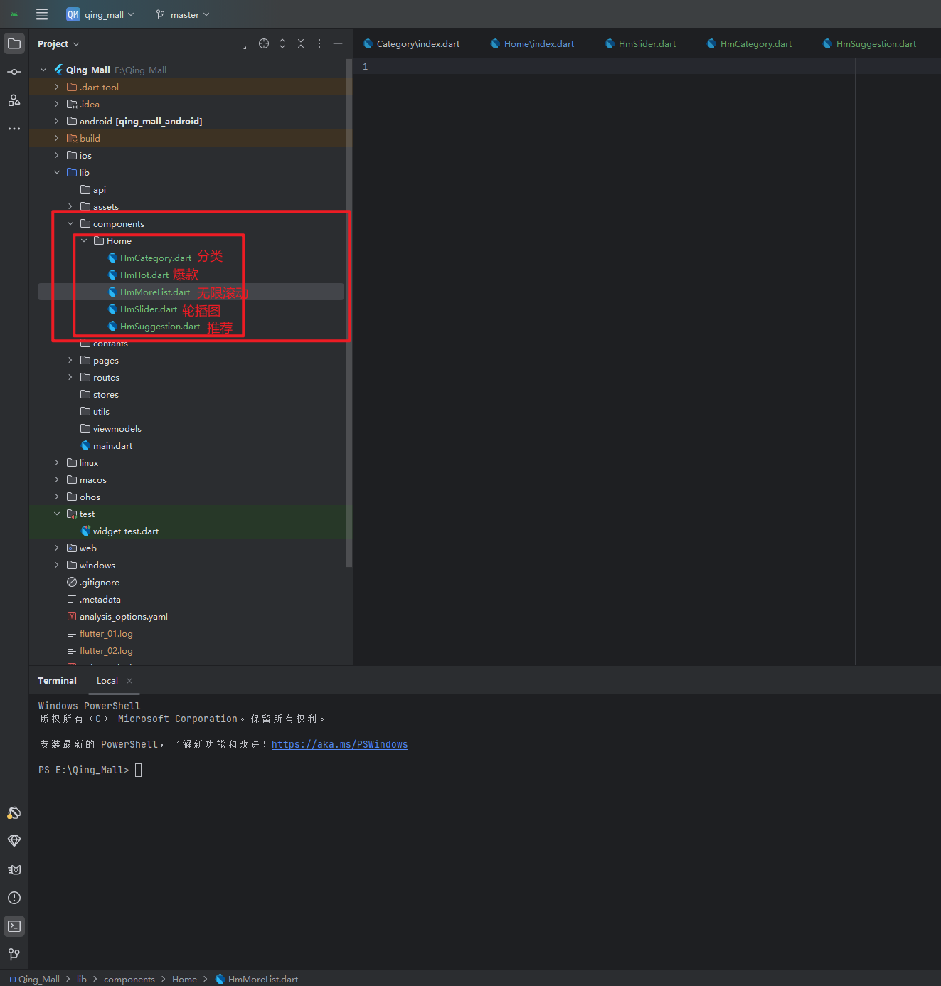 在lib/components下新建Home文件夹,分别新建HmSlider.dart文件,HmCategory.dart文件,HmSuggestion.dart文件,HmHot.dart文件,HmmoreList.dart文件