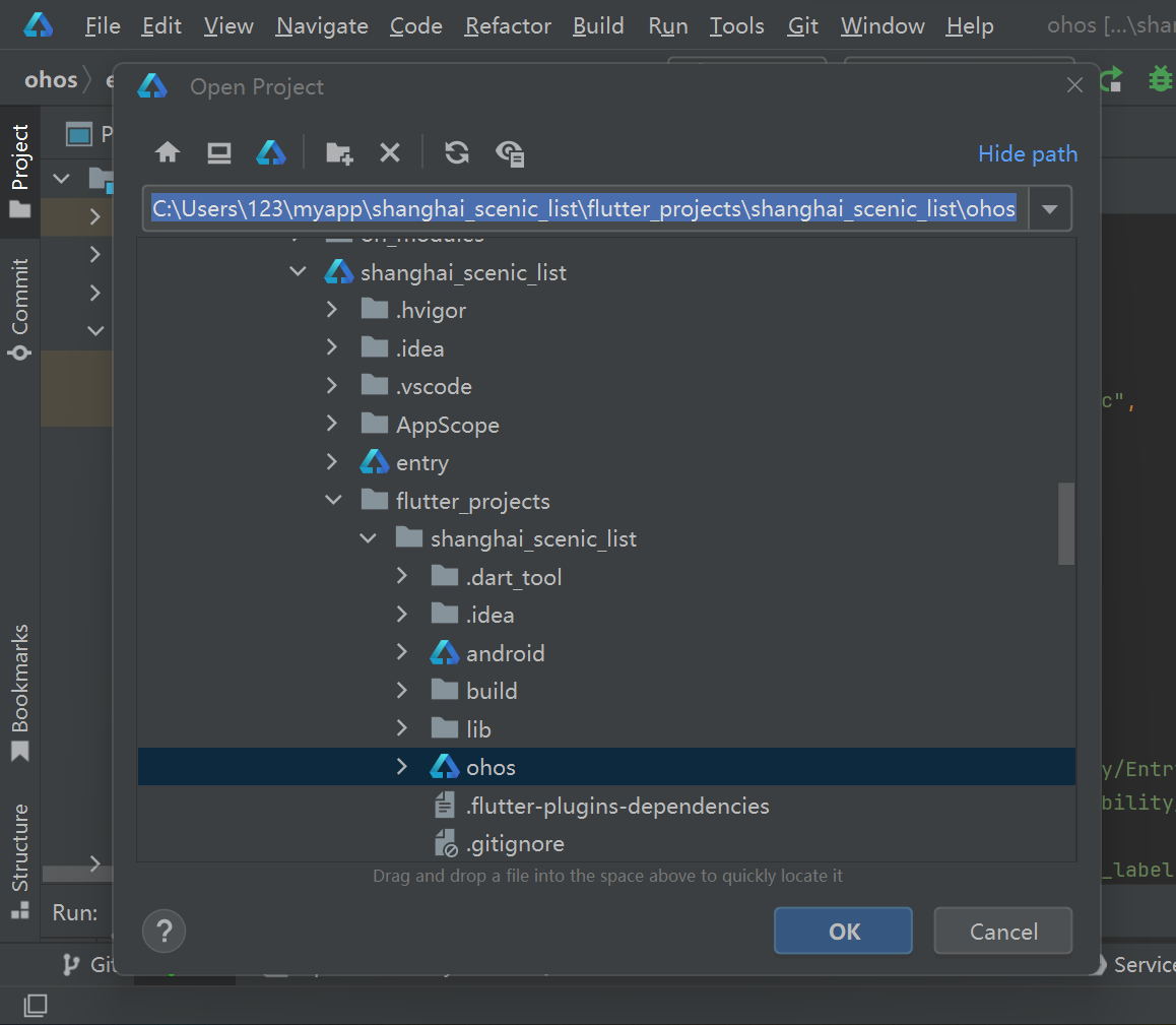 打开DevEco Studio→File→Open→打开文件下的ohos,如下