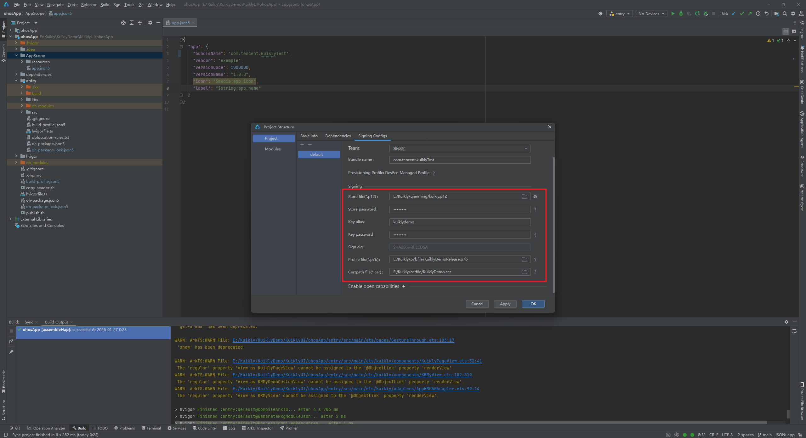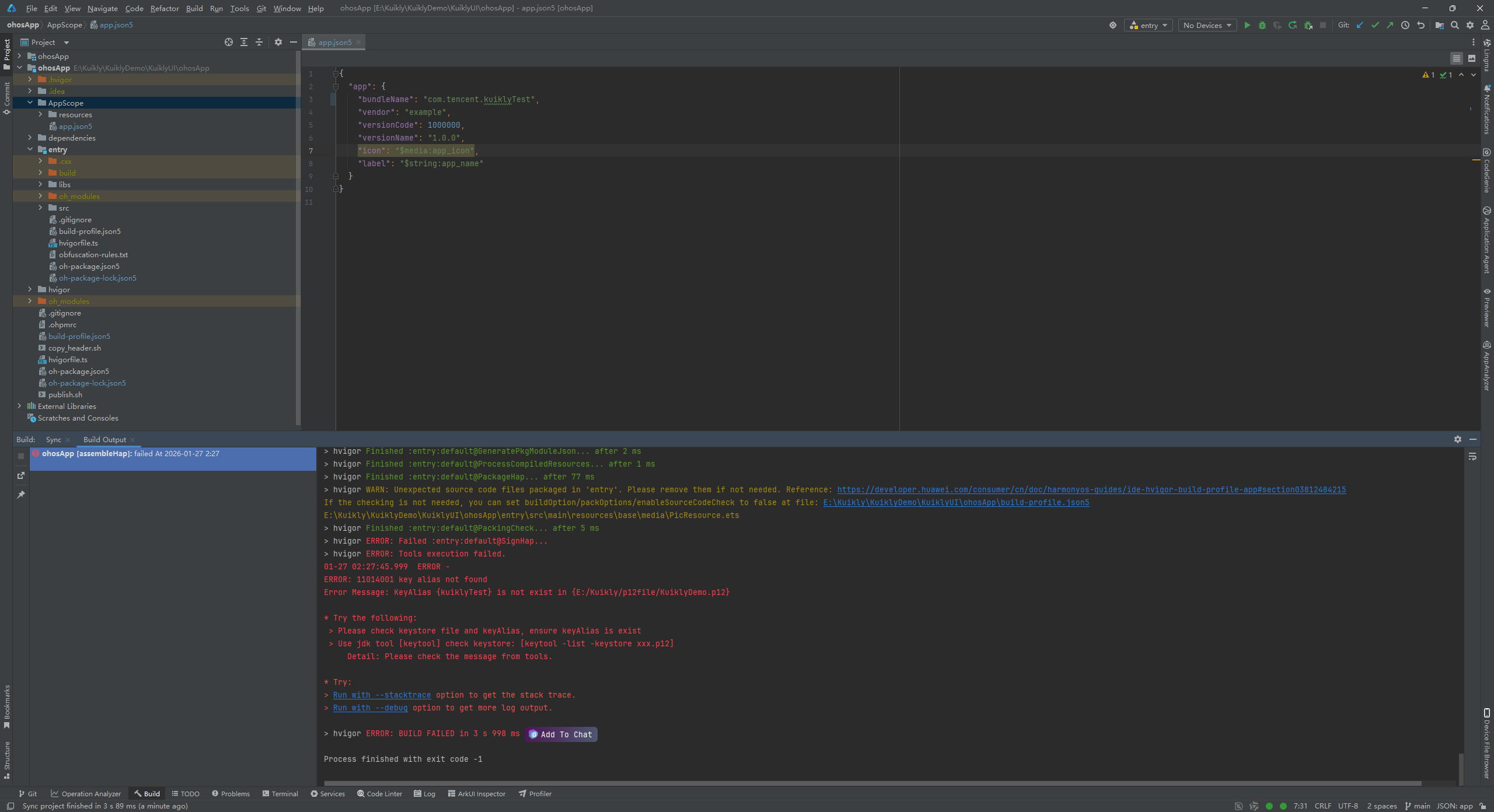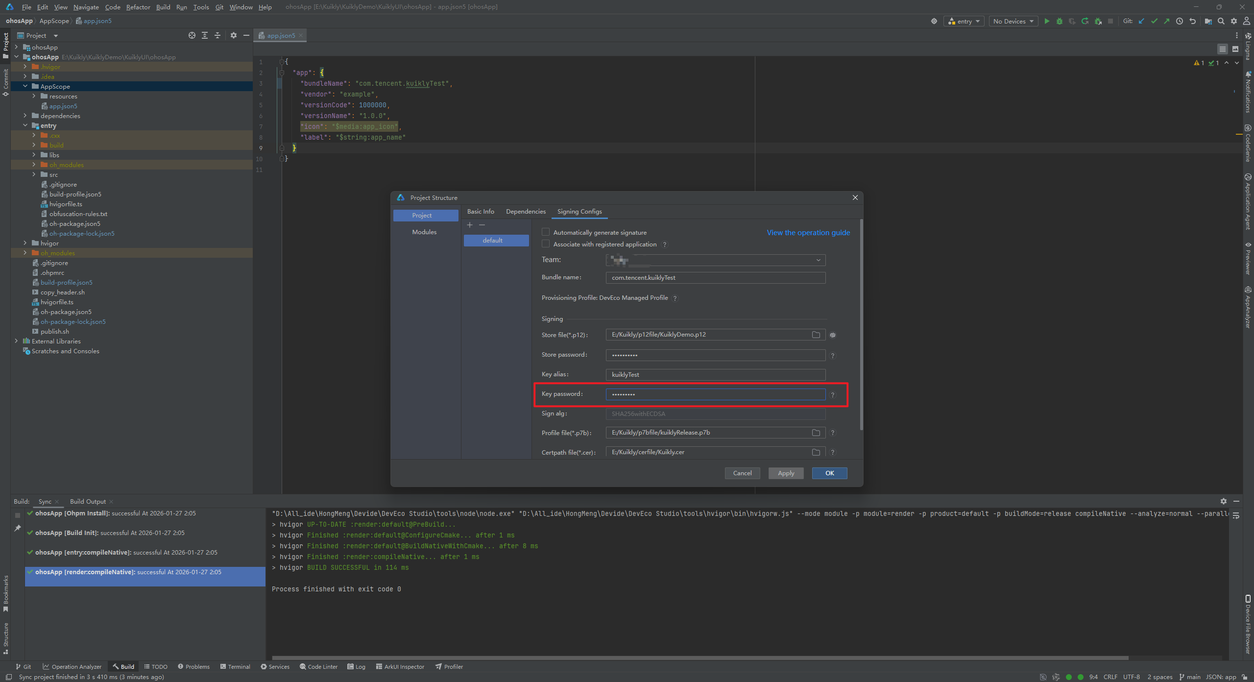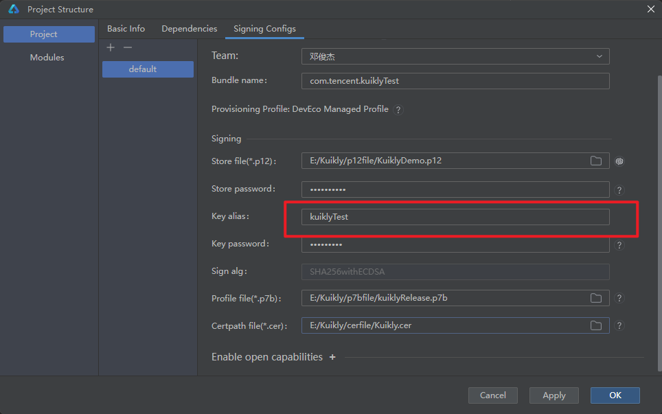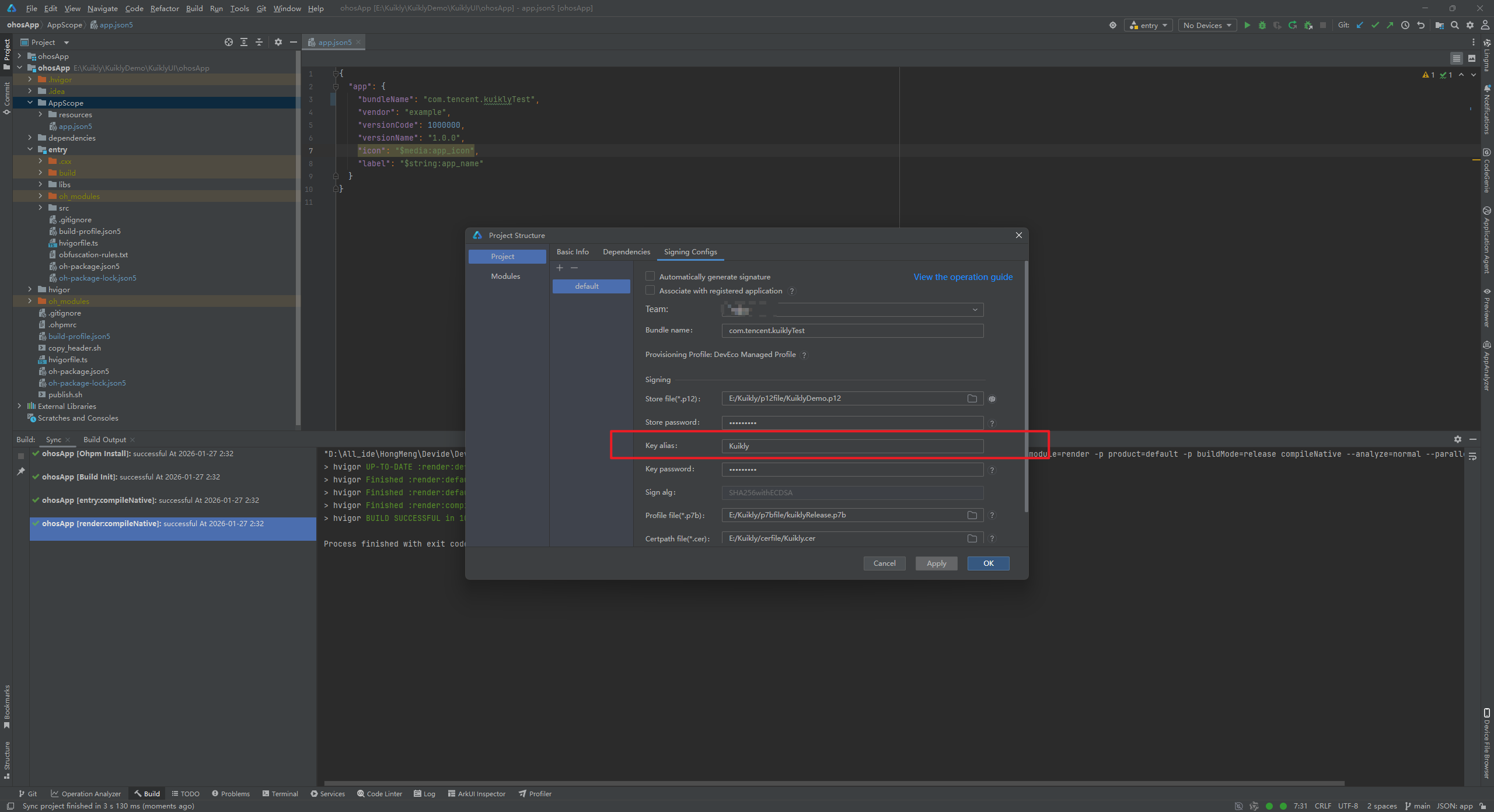 (2)key alias别名错误,翻看看我上面的文章,看到别名叫做Kuikly。我们更改好,点击OK。再次进行构建Hap包。