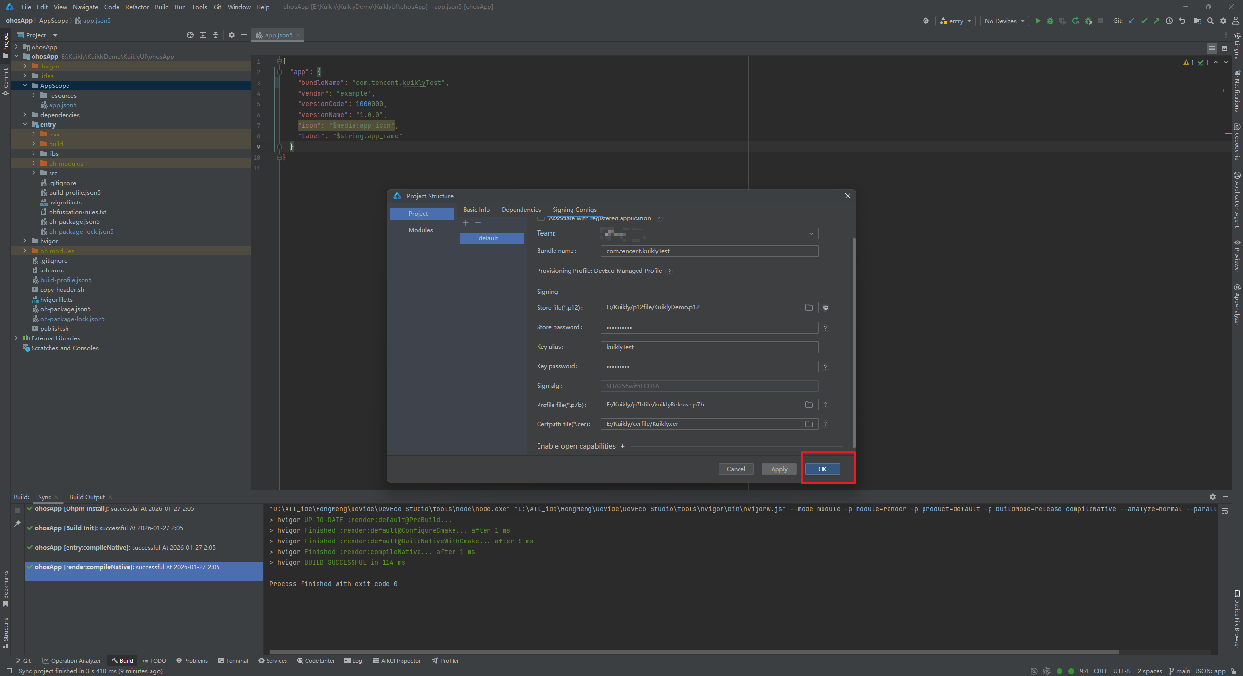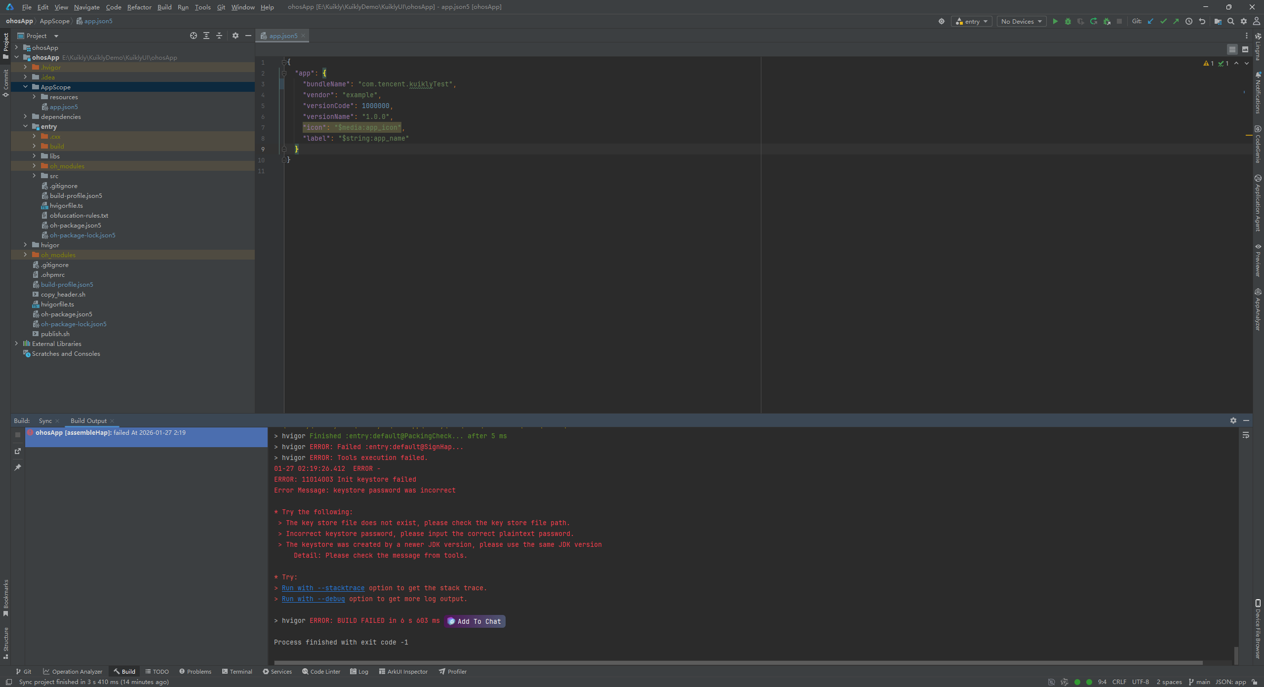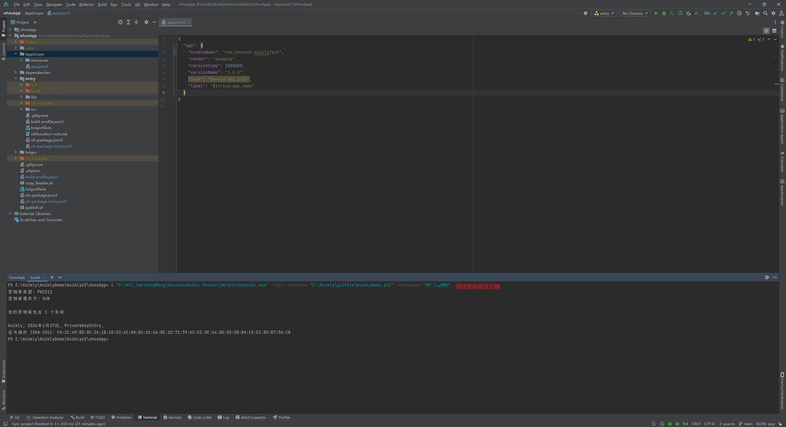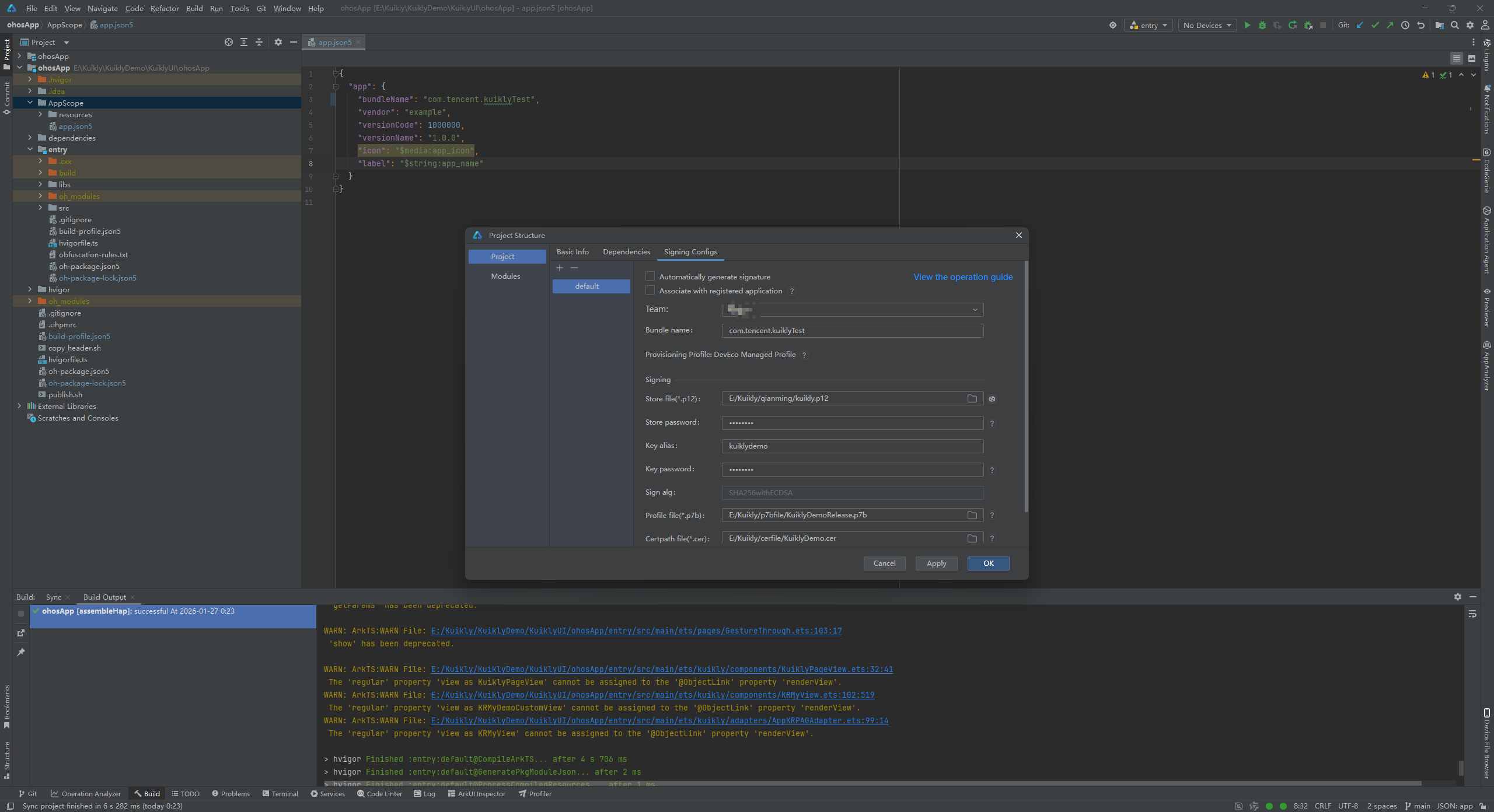 (2)key alias别名错误,翻看看我上面的文章,看到别名叫做Kuikly。我们更改好,点击OK。再次进行构建Hap包。