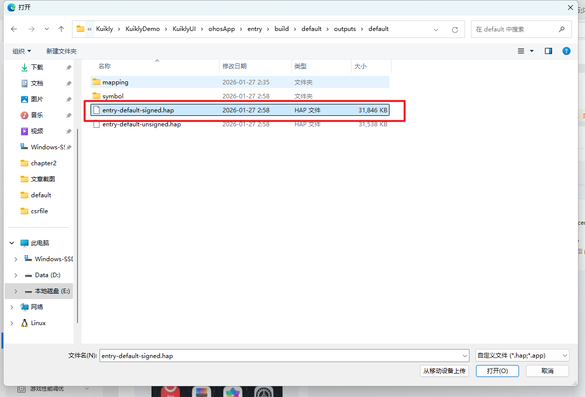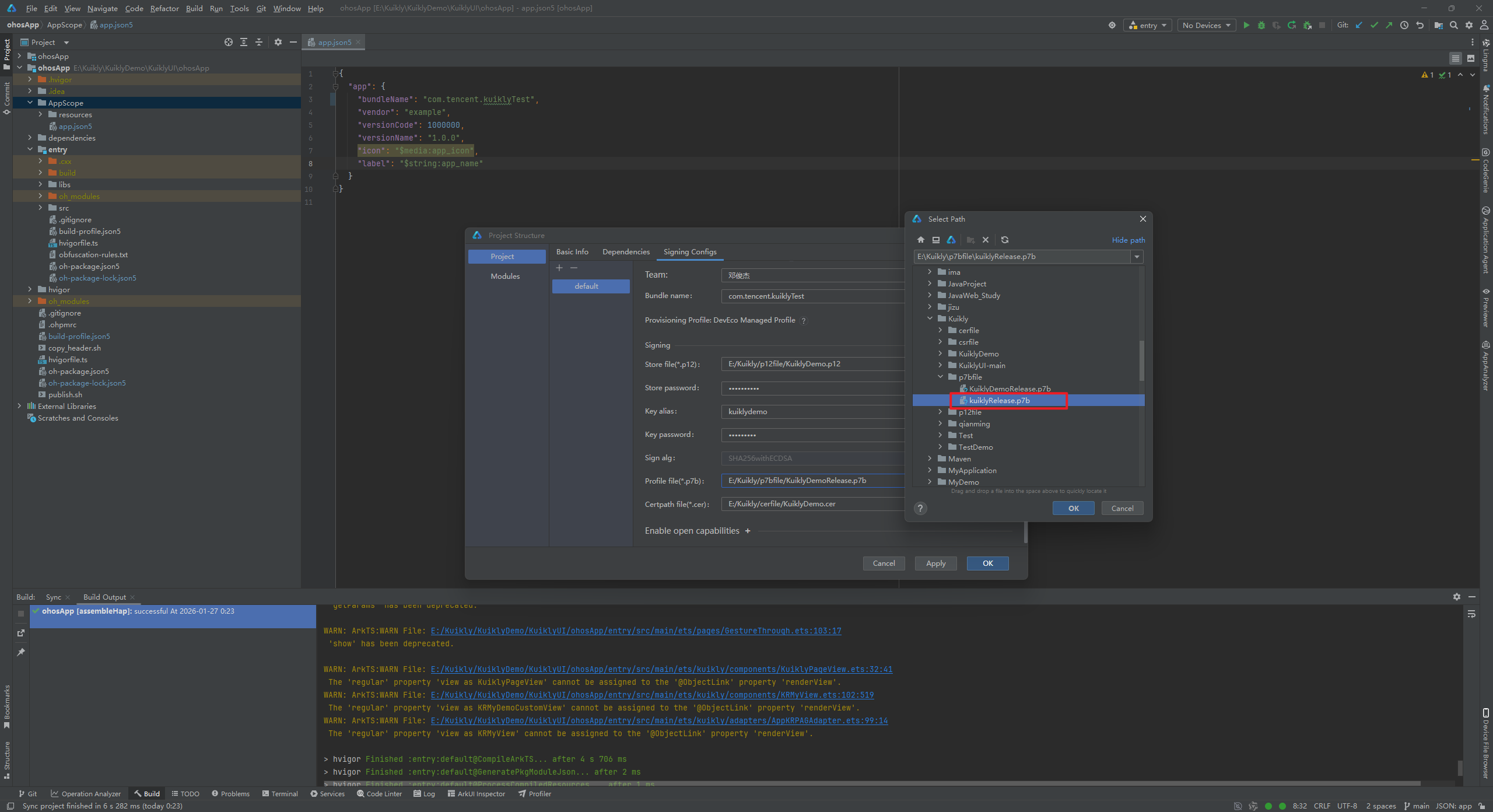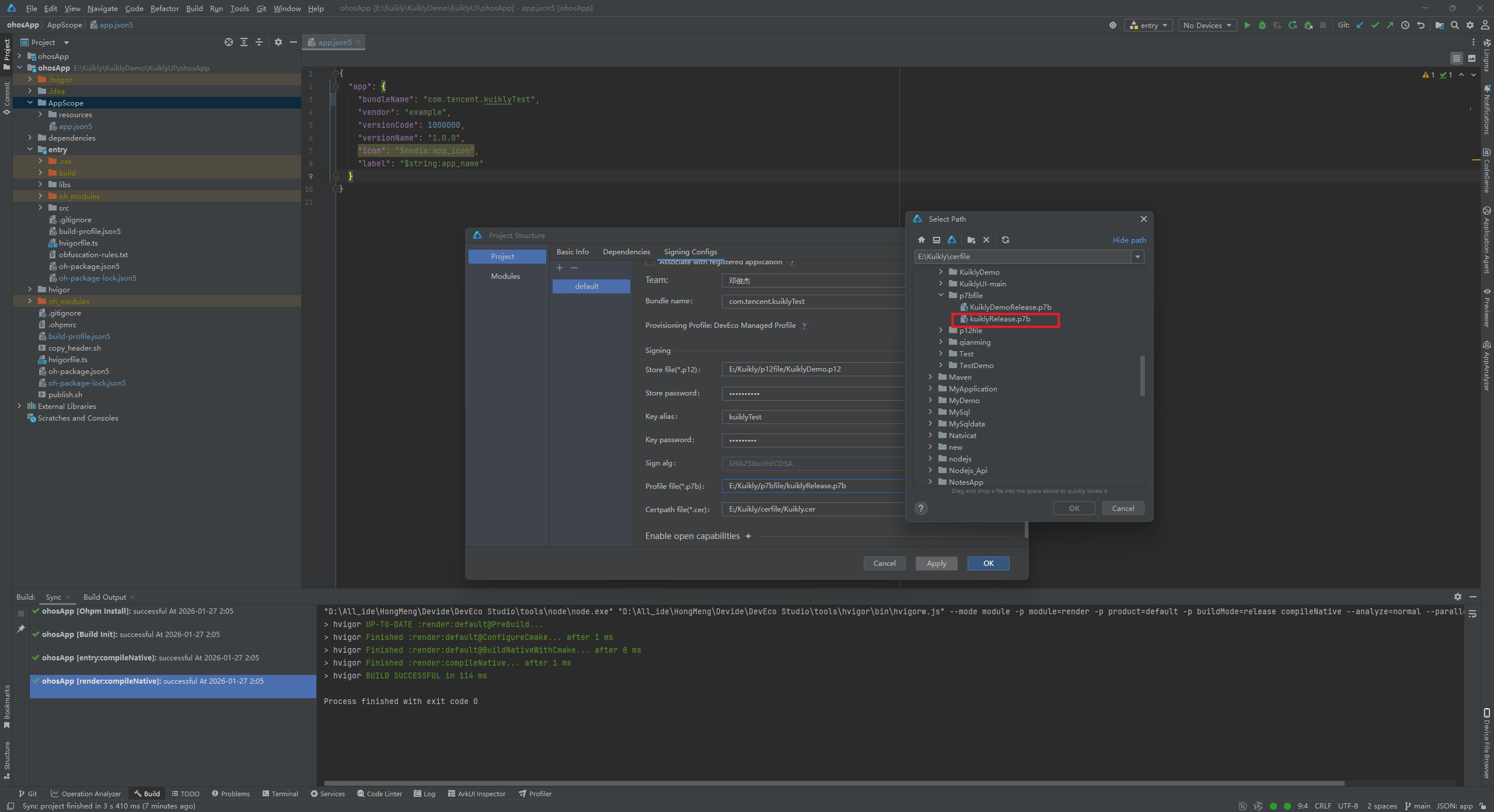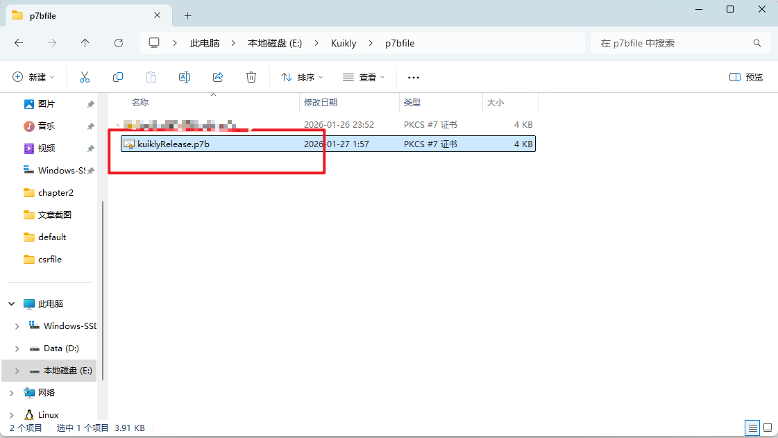 这个时候我们得到的kuiklyRelease.p7b文件。此时我们所需的文件已经集齐,接下来返回DevEco Studio进行后续操作。