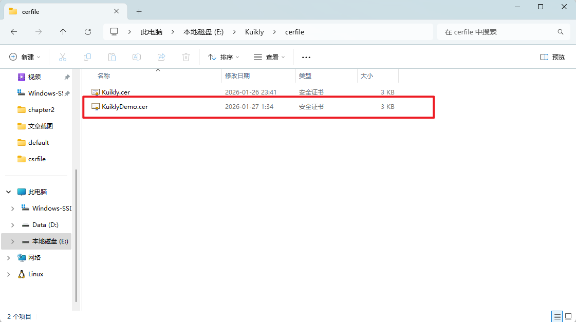 自己提前新建好一个名为cerfile的文件夹,用于存放.cer文件。